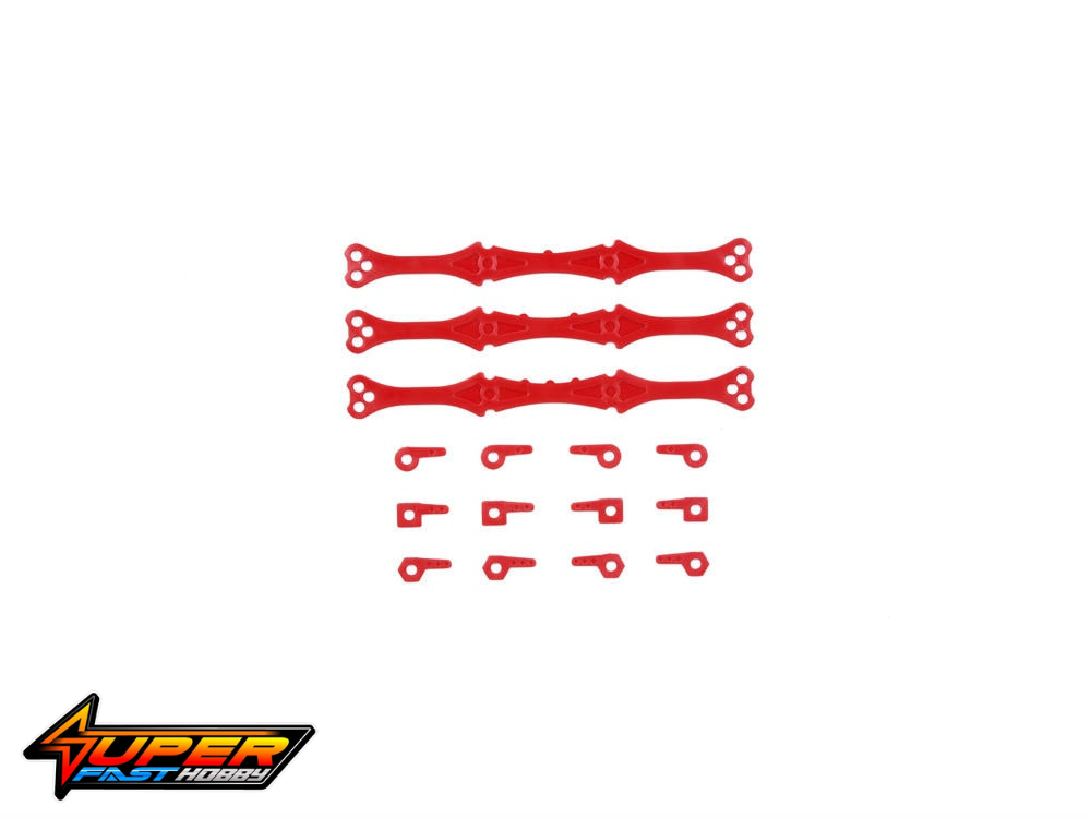 ★These adjuster plates can be put between your chassis and roller stays/plates etc. to fine-tune roller downthrust. ★Set at one, two and three degrees, they can also be reversed to allow a total of six settings. ★Washers are included to adjust roller angle. ★Parts are molded in vibrant red.