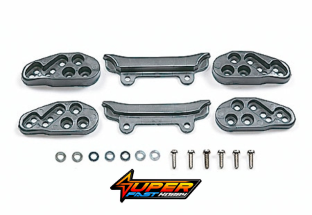 From time to time at jump sections, Mini 4WD machines get caught on the course fence leading to retirement. This Front Under Guard has a three-piece design to be compatible with normal and wide roller settings and will greatly improve your machines success of completing the race. They also feature a skid angle design incorporated to assist breaking. Kit includes parts for use with large and small diameter tire machines. Can be used with Mini 4WD PRO, VS, and Super XX chassis machines.