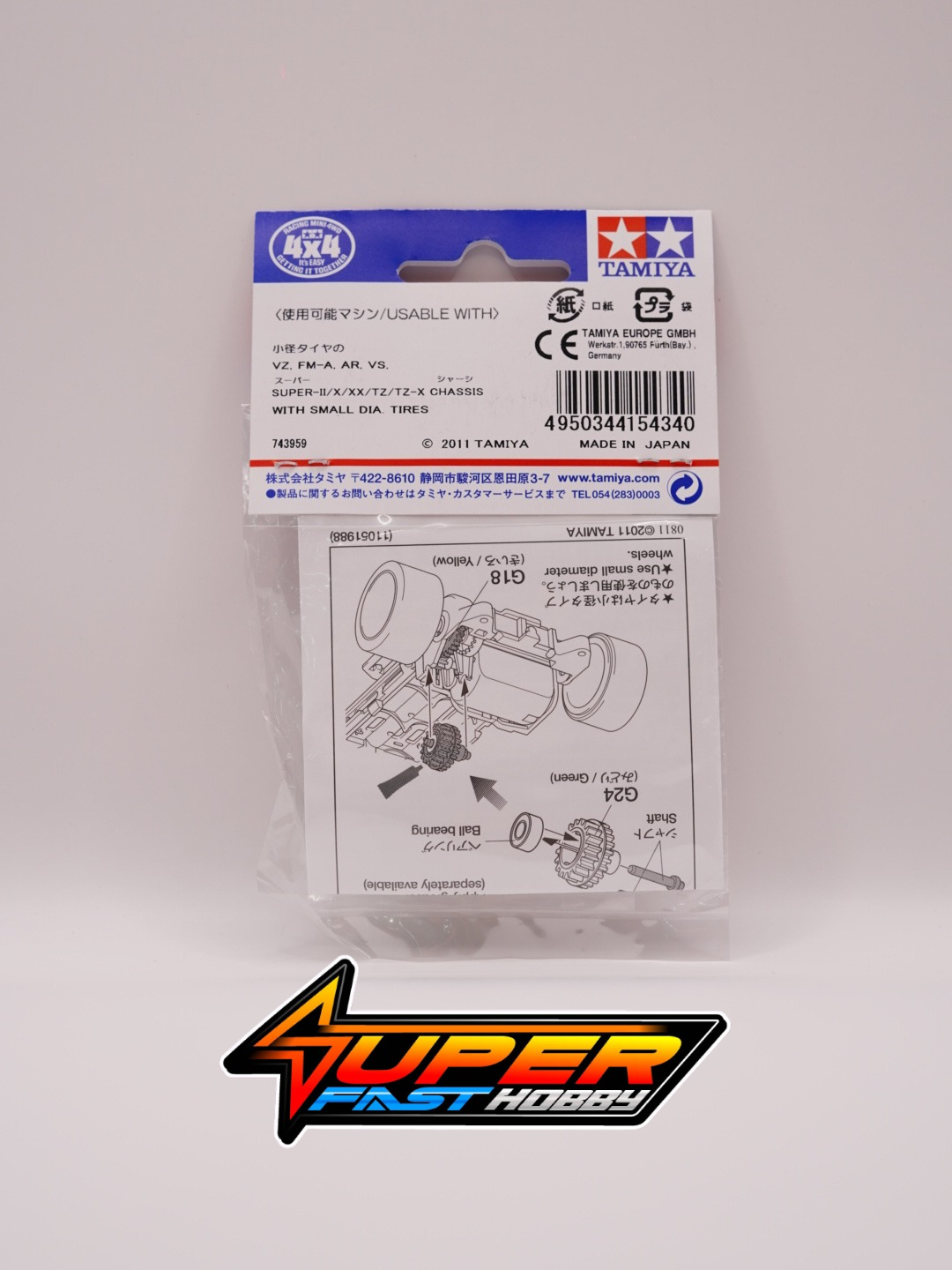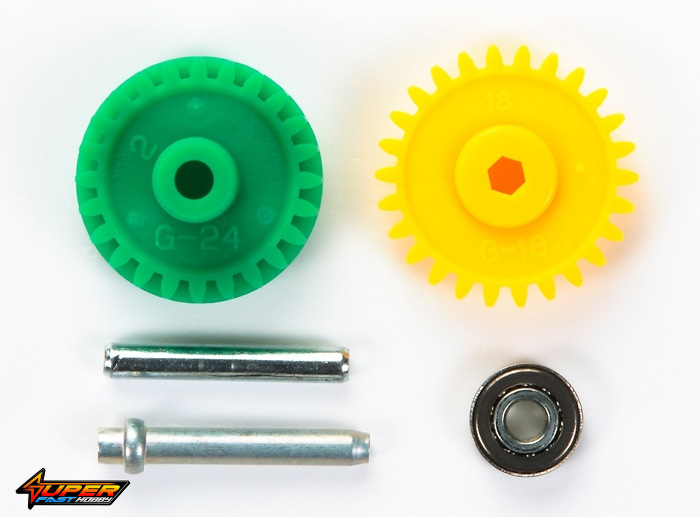 This set includes gears, shafts, and round-hole ball bearings that can be set to a gear ratio (3.7:1) between the high-speed gear and the super-speed gear. Compatible with a wide range of Mini 4WD models, and changing from the super-speed gear is easy; all you need to do is replace the counter gear (green) in this set. To change from a gear ratio other than the super-speed gear to 3.7:1, also replace the spur gear built into the shaft with the spur gear (yellow) in this set.