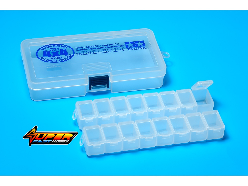 ★This set includes two 8-compartment storage cases housed in an outer case for a total of 16 independent storage sections to hold small parts such as screws and nuts. ★Two of these sets will fit perfectly inside a compartment of the Mini 4WD Portable Pit.