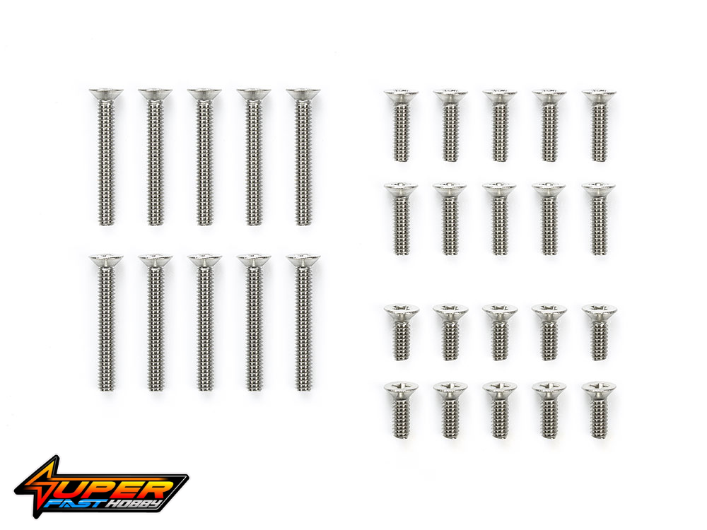 ★With the correct holes, countersunk screws sit flush to the surface they are attached on, for less chance of catching on the track surface, etc. and causing damage or loss of speed. ★This set includes ten each of 6mm, 8mm and 15mm screws crafted in stainless steel.