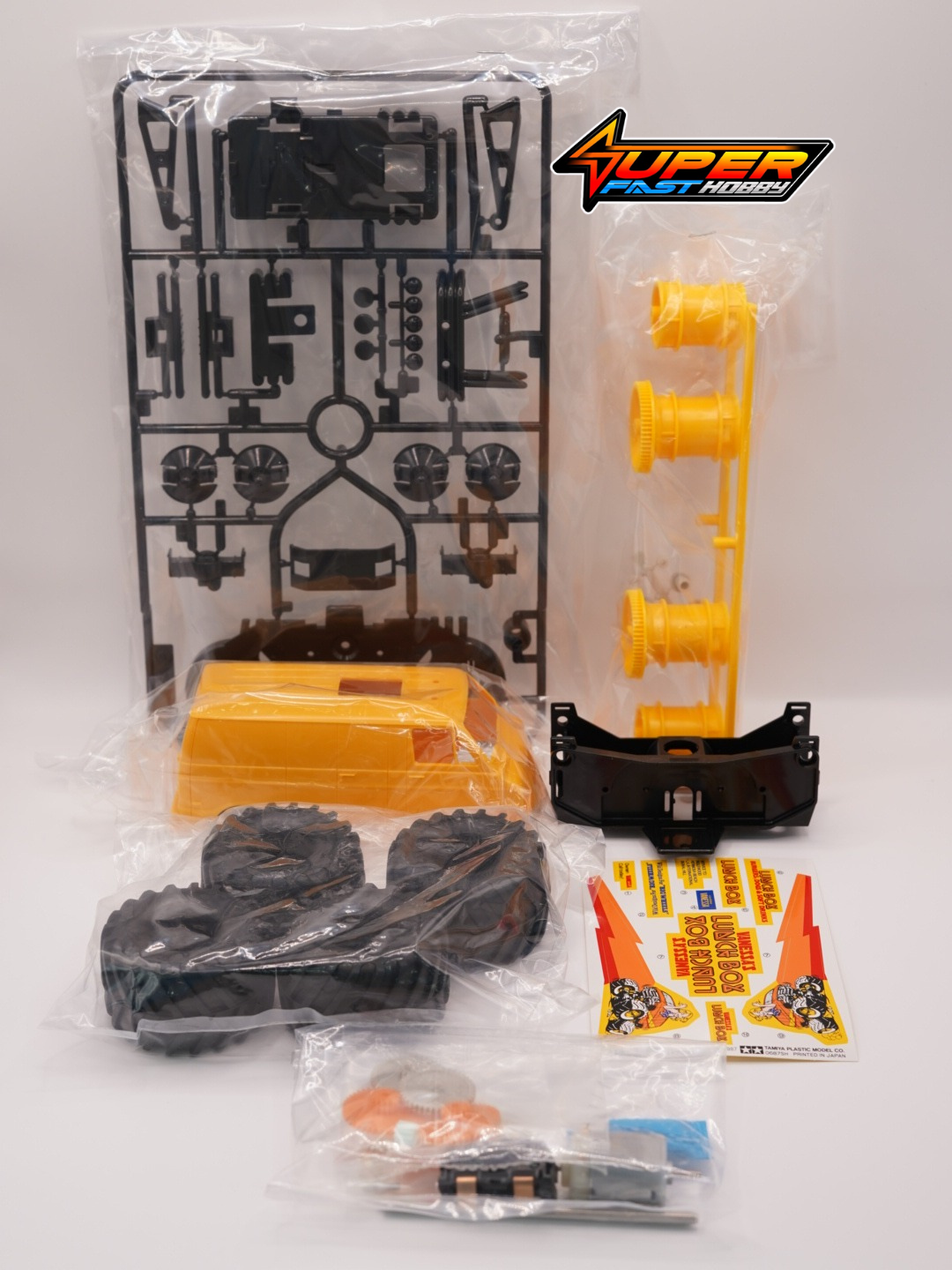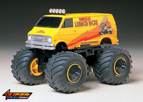 This plastic assembly kit features 4WD and large-diameter tires to enable exciting wheelie and two-wheel driving action. The motor is mounted at the center of the chassis and provides power to the front and rear wheels via a sidewinder gear setup. The comically-styled body is matched with 52mm diameter, 31mm wide tires for plenty of laughs and the model’s easy assembly does not require any cement.