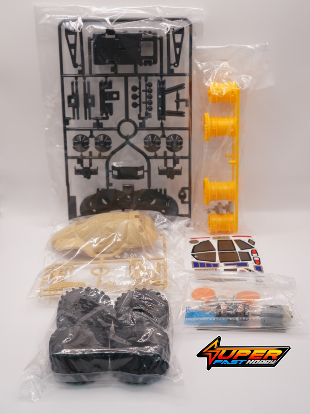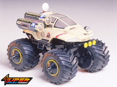 This plastic assembly kit features 4WD and large-diameter tires to enable exciting wheelie and two-wheel driving action. The motor is mounted at the center of the chassis and provides power to the front and rear wheels via a sidewinder gear setup. The comically-styled body features futuristic touches such as the headlights, radome, armor panels, and antennas, and the model’s easy assembly does not require any cement.