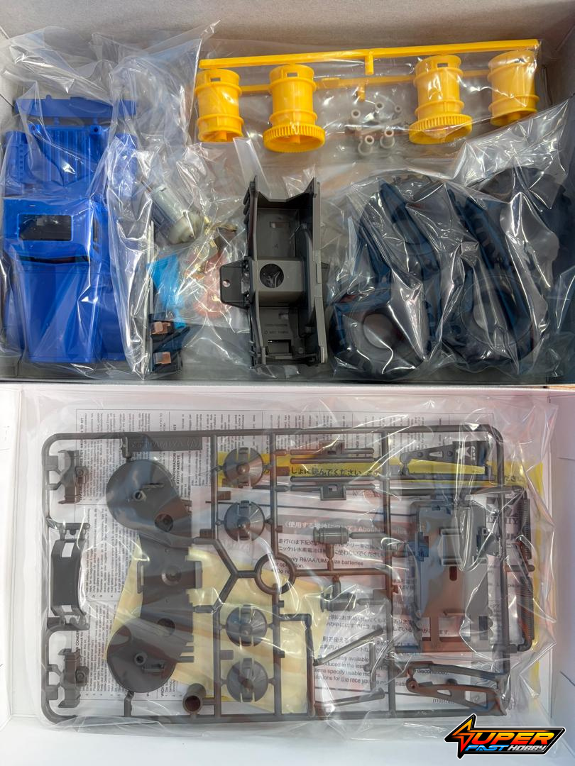 This plastic assembly kit features 4WD and large-diameter tires to enable exciting wheelie and two-wheel driving action. The motor is mounted at the center of the chassis and provides power to the front and rear wheels via a sidewinder gear setup. The comically-styled body features separate parts for the air cleaner and muffler for greater realism and is matched with 52mm diameter, 31mm wide tires for plenty of laughs. In addition, the model’s easy assembly does not require any cement.