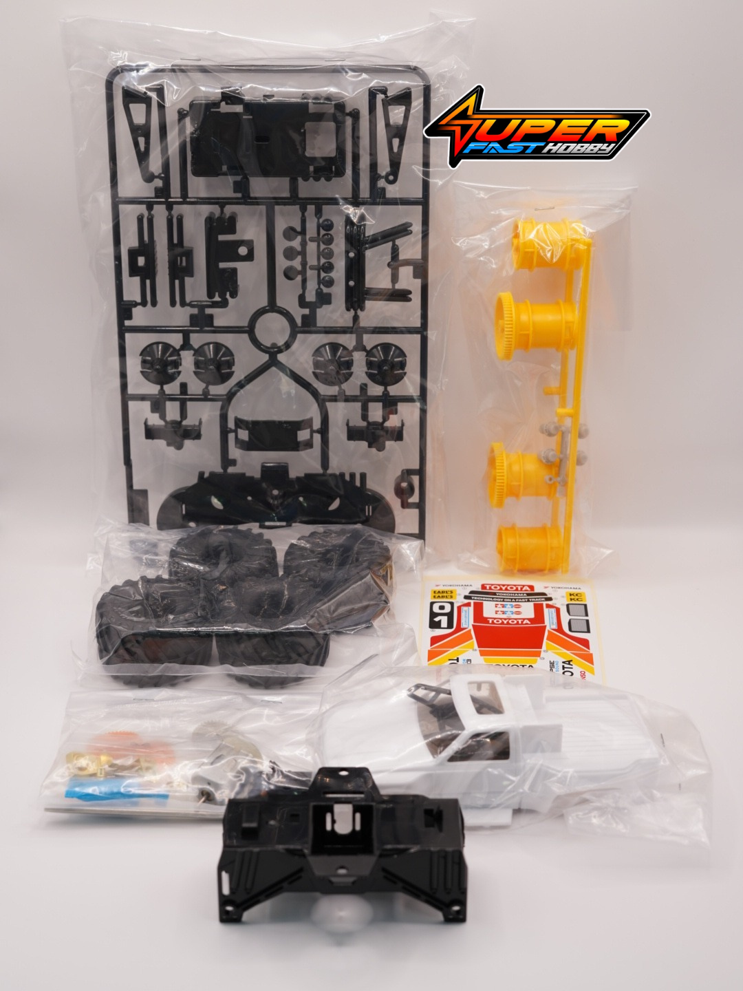 This plastic assembly kit features 4WD and large-diameter tires to enable exciting wheelie and two-wheel driving action. The motor is mounted at the center of the chassis and provides power to the front and rear wheels via a sidewinder gear setup. The stylish body is matched with 52mm diameter, 31mm wide tires for plenty of laughs and the model’s easy assembly does not require any cement.