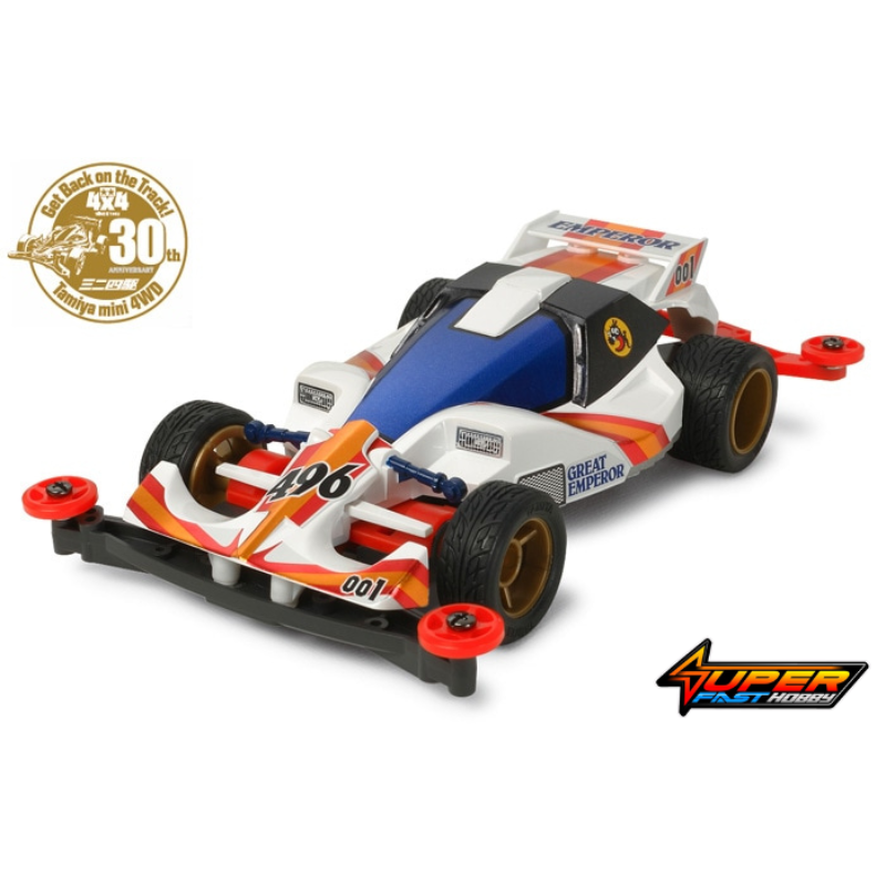 ★The Mini 4WD Great Emperor is now offered on the modern Super-II chassis to help commemorate the 30th anniversary of Tamiya’s Mini 4WD products. ★Front and rear wings are removable. Newly-designed metallic stickers enhance the machine’s appearance. ★Super-II chassis is conveniently equipped with Easy Locking Gear Cover.