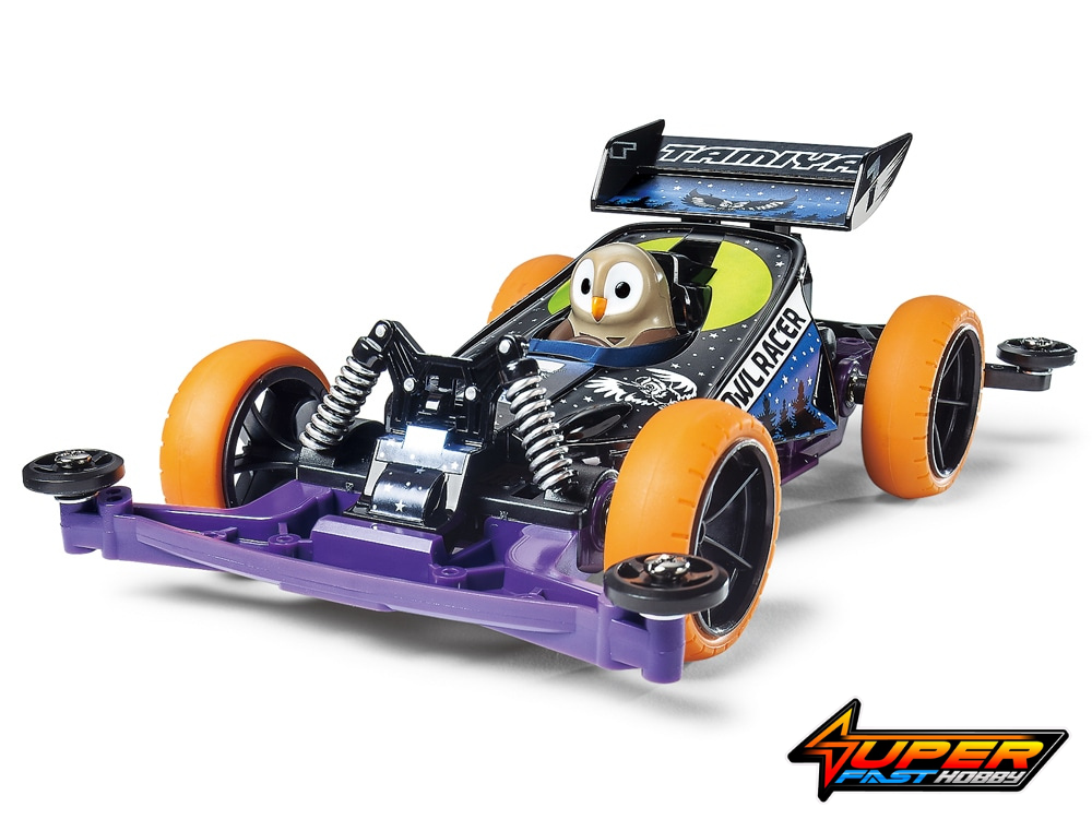 This is a Mini 4WD model assembly kit which creates the Owl Racer, with a stylish single seater buggy-inspired body molded in white and paired with a wide-eyed pre-assembled and painted owl driver. Stickers are included in the kit to decorate the model, and include night sky designs.
