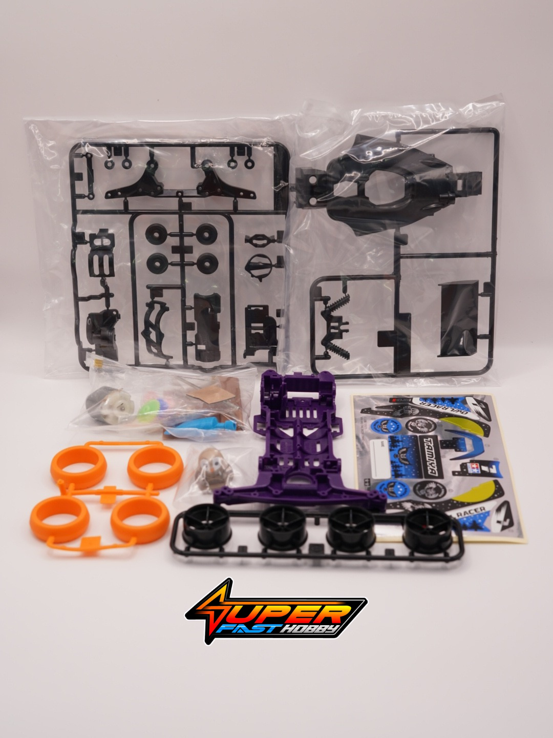The Super-II chassis offers impressive toughness on an adaptable frame. Here, it appears in violet ABS resin and is matched with black color battery holder, rear stay and rollers. Lightweight black wheels are paired with orange large-diameter arched tires, and the model comes with a 5:1 gear and motor.