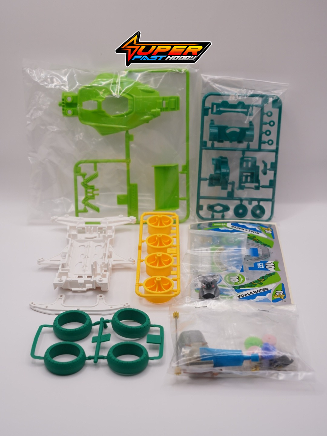 G’day Mini 4WD fans! This assembly kit creates the Koala Racer, a fun car with open top body and finished Koala Racer figure ready for attachment. Australia-esque themes are on display, with the wedge-shaped body molded in yellow-green ABS, and stickers included in the kit to create colorful decorations including images of a blue sky. The VS chassis and other parts are given complementary color schemes to round off the look.