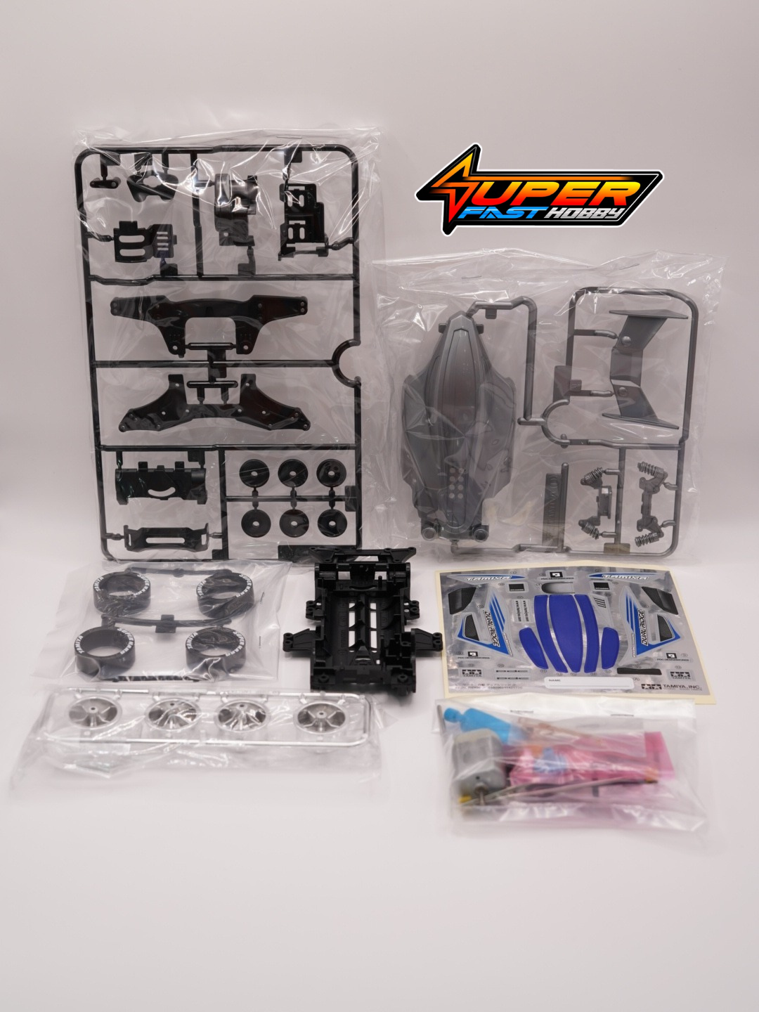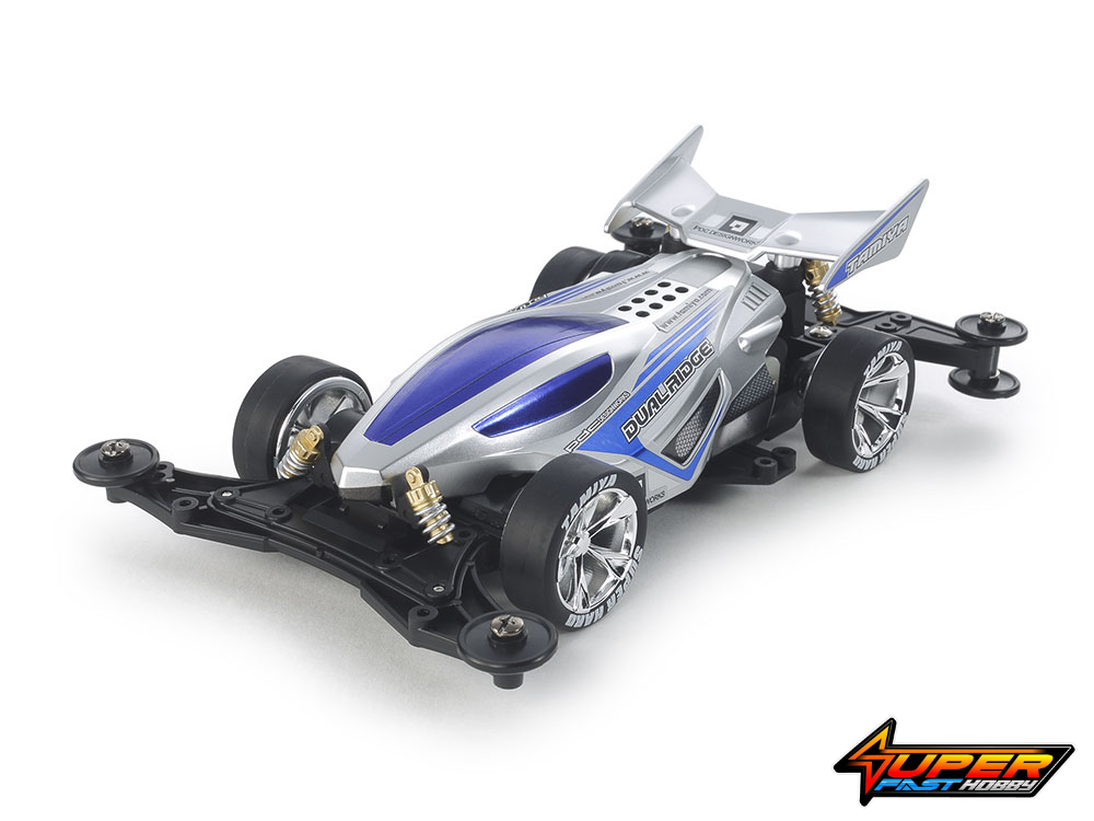 This assembly kit creates the Dual Ridge Jr., a Mini 4WD car that serves as a younger sibling to the famous Tamiya R/C car designed by Takayuki Yamazaki. Yamazaki was involved in the design of this product too, and it has the trademark bulging cockpit and oversized rear wing. Eight small holes have been integrated into the roof to help funnel air in for cooling purposes. It runs on the VZ chassis, a compact and versatile unit that will mean your little Dual Ridge Jr. is the talk of the racetrack – wherever you race!