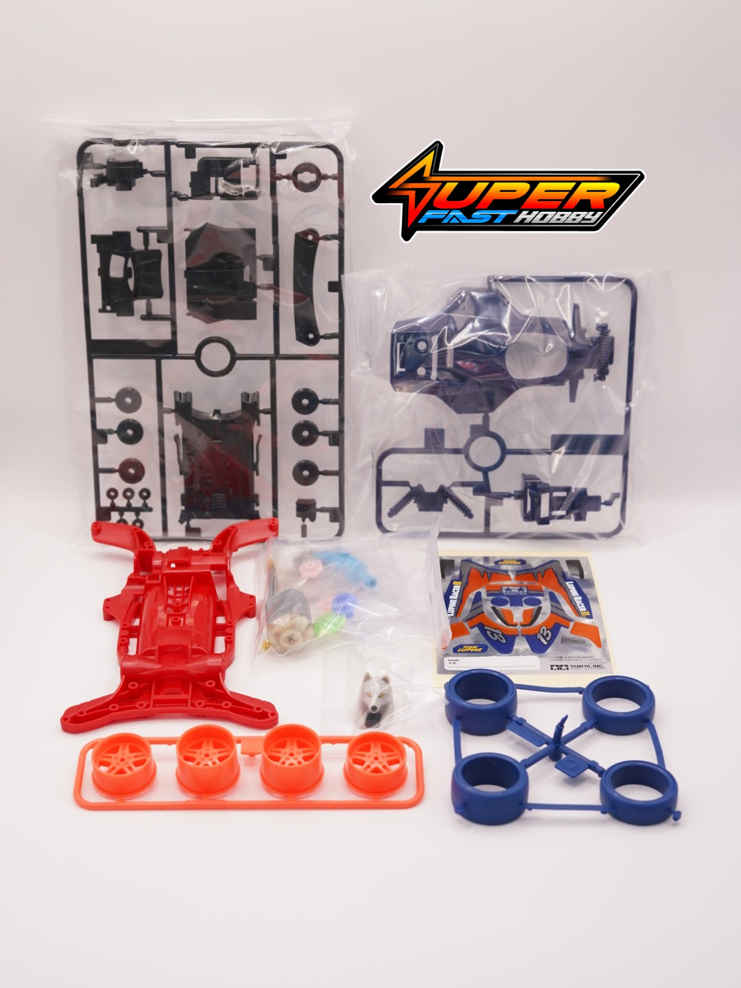 This assembly kit creates the Lupine Racer 2, a high performance Mini 4WD car that uses the Thunder Shot open top body and is piloted by the Lupine Racer figure (which is pre-assembled and painted). The AR chassis is an aerodynamically-honed design molded in tough polycarbonate-ABS, adn fitted with orange 5-spoke wheels and dark blue large-diameter slicks. Metallic stickers are included in the box to decorate the car.