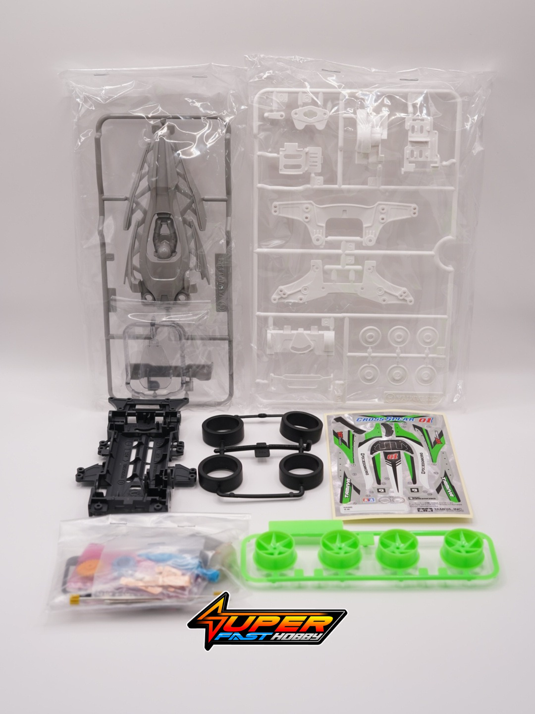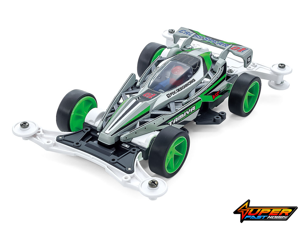 The Cross Spear 01 was designed by Takayuki Yamazaki, who also penned the DCR models among other Mini 4WD designs. Its body features eye-catching truss sections extending from front to rear, plus a canopy molded in tinted plastic. The VZ chassis is a compact base for the model, and comes in gray plastic with white A parts, accented by green spiral spoke wheels with small diameter, low-profile super hard tires.