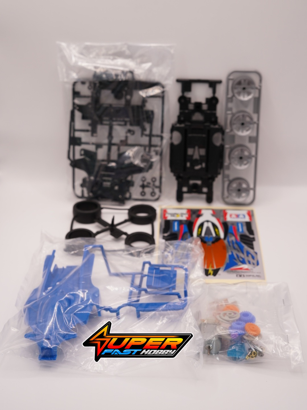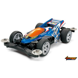This high-performance Mini 4WD racer features a 3-piece chassis with nose, center, and tail sections for easy snap-together assembly. Double shaft motor drives all 4 wheels and is located at the center of the chassis with 1 battery on each side for excellent balance. Mounted on this chassis is a daring futuristic body shell that features a canopy integrated with the nose and a multi-step rear wing. On this blue-colored body is the silver Japanese character for “Thunder,” which offers a nice color balance with the large diameter wheels that are also in silver. In addition, there is a large variety of Grade-Up Parts to choose from to customize your machine