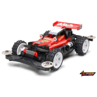 Tamiya’s first R/C 4WD racing buggy “Hotshot” now lines up in the Mini 4WD PRO Series as the “Hotshot Jr.” The dynamic form, front/rear dampers, large rear wing and minimum body cowling are all realistically reproduced on the modern MS Chassis, as well as pin spike tires on 4-spoke wheels which raise the mood of the buggy. The centrally located double shaft motor effectively transmits power to all four wheels for optimum performance and the “One-Touch” three piece chassis requires no glue and is a breeze to assemble. In addition, there is a large variety of Grade-Up Parts to choose from to customize your machine. This machine is definitely one for all Hotshot fans.