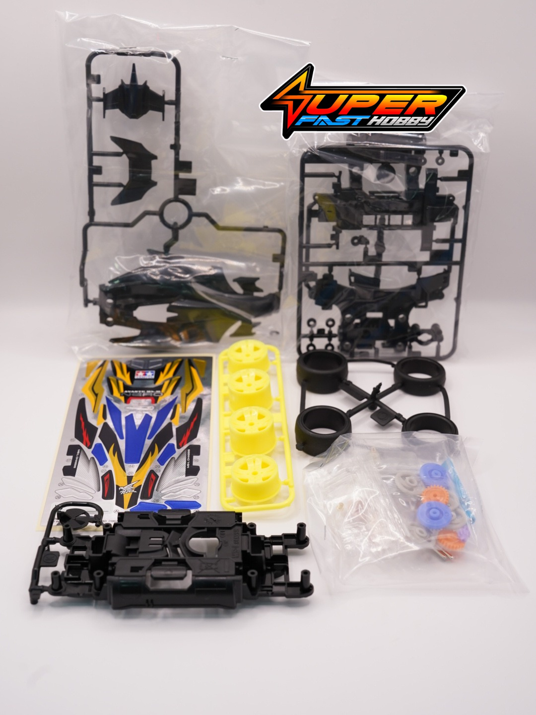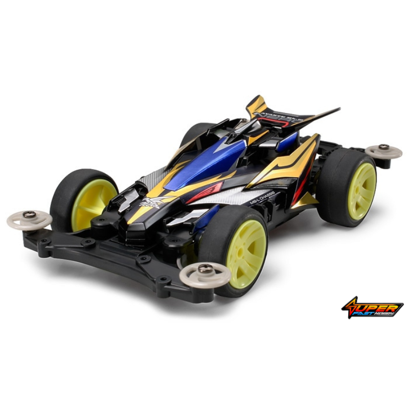 Smart Money is on BlackThis black plastic assembly kit Mini 4WD Pro is one machine that you will love racing. The centrally located double shaft motor effectively transmits power to all four wheels for optimum performance. The “One-Touch” three piece chassis requires no glue and is a breeze to assemble. You will enjoy the fast speed of this machine and its wide choice of settings. Also, the batteries are horizontally placed for improved center of gravity allowing for a more stable driving action at fast speeds. The Avante Mk.III Nero has a lightweight center chassis and an N-02 nose unit. The superbly designed Avante body features front and center wing tips as well as a small rear wing making it more aero dynamic for high speed racing. The black base color along with its gold and silver graphics finish off its slick dynamic form.
