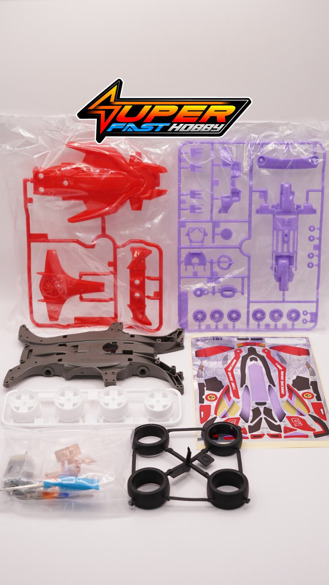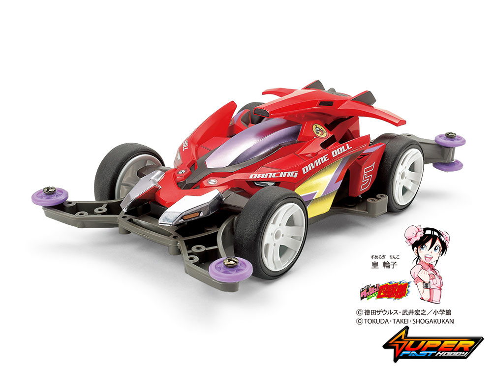 This assembly kit creates the Dancing Divine Doll, an exciting Mini 4WD racer which appears in the Japanese cartoon Hyper Dash! Yonkuro as the car of Sumeragi Rinko. It draws inspiration from the original Dancing Doll model – motifs such as the large duct fan – while giving the design concept a large overhaul. Body parts are molded in a vivid shade of red, and metallic stickers are included in the kit to decorate it with graphics, car name and more. The model is based upon the MA chassis, molded in Olive Gray ABS and with Purple low-friction A Parts. White 4-spoke wheels are paired with slick tires.