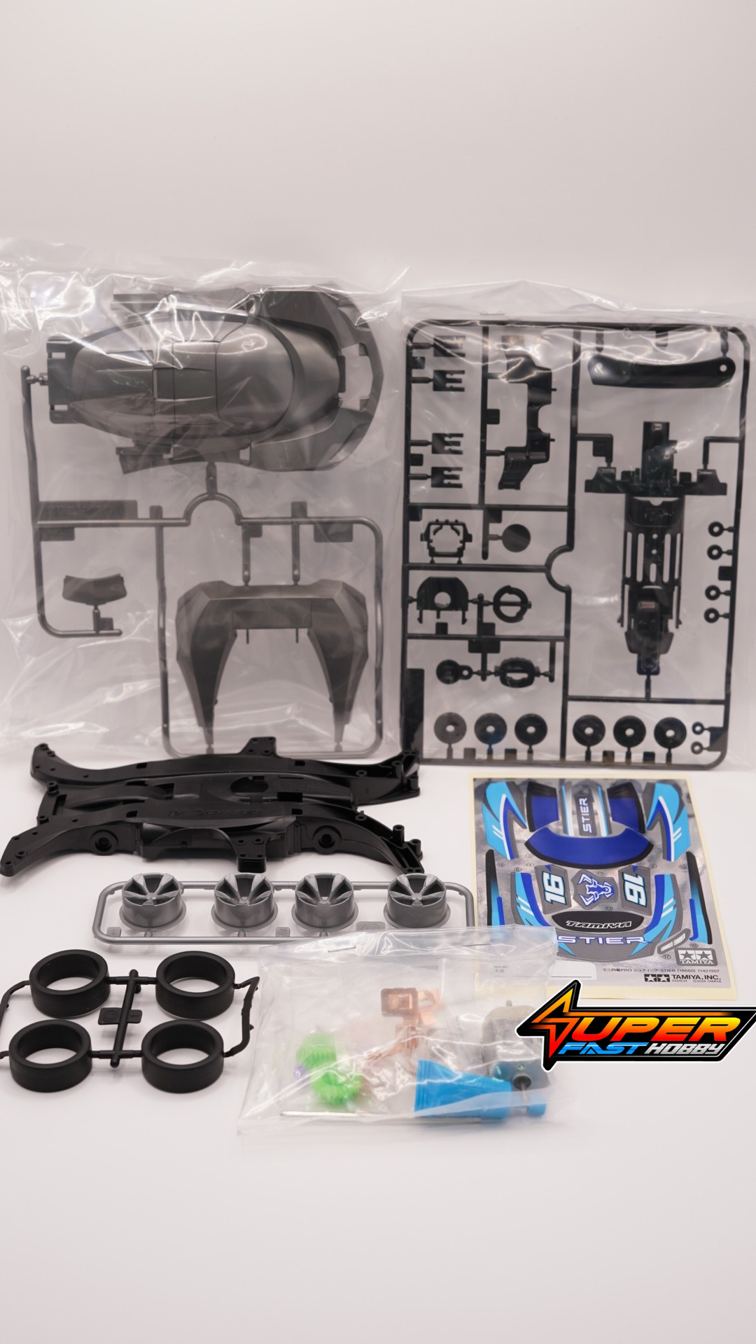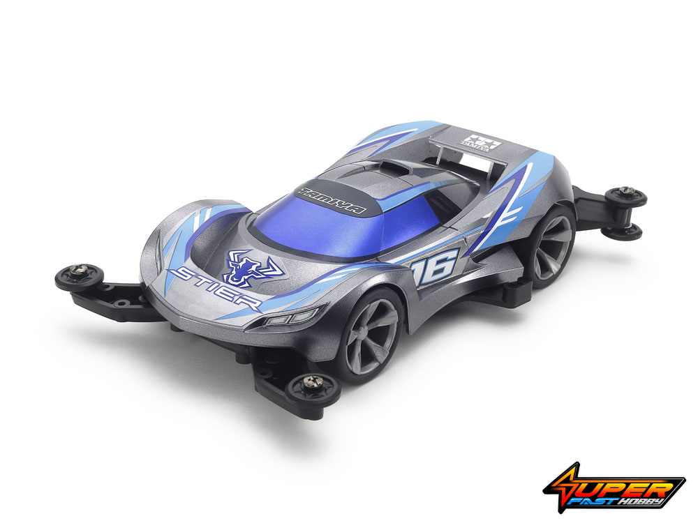 This assembly kit creates a Mini 4WD racer called Stier, which means “bull” in German: its hypercar-esque body has a horn-like U shaped design at the front. At the rear, the fenders run smoothly into the wing; they are molded as a separate part. The MA chassis is a great choice for this model, and is paired with 5-spoke wheels and small diameter low profile tires. Stickers are included for body details and car numbers.