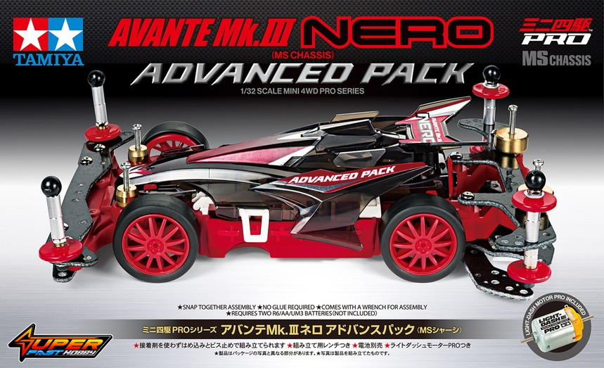 This Mini 4WD kit takes the Avante MK. III Nero kit (item 18627) and pairs it with various performance parts including a Light Dash PRO Motor to get racers up to speed with a tuned chassis.