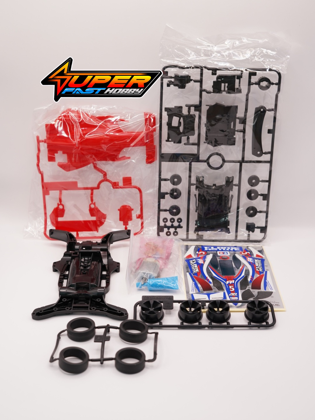 This is a plastic model assembly kit of a high-performance mini 4WD racer. The Mini 4WD REV Series showcases models that feature an aerodynamically efficient body and chassis combination. The Flame Astute artfully blends elements from the Tamiya R/C Astute model with the looks of a modern day U.S. racing machine, and the results are stunning! It has a slimline nose offset by a widened rear section, and its aerodynamic performance is boosted by the front wing, side pontoons, curved rear wing and induction pod air intakes. With the racy red body complemented by blue, white and silver markings as well as metallic logo stickers, plus classy low-profile tires, the Flame Astute is bound to be one hot customer at your local Mini 4WD track. Make sure it’s YOUR Flame Astute that everyone is watching!