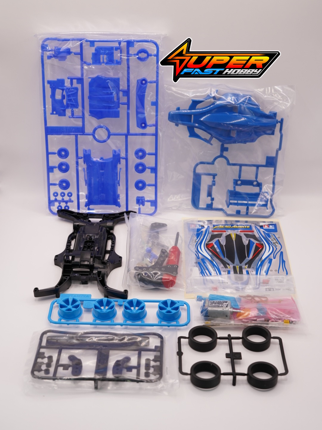 Get ready to race! This handy set combines the popular Aero Avante Mini 4WD car kit with race spec option parts and basic tools. Fitting the option parts in the set turns the Aero Avante into a swift racer suited to tracks with long straight sections and fewer corners. Included are a Rev-Tuned 2 motor, super hard tires (black), brake set, side mass damper set and FRP plates for the front and rear of your car. With relatively few spacers and screws, assembly is kept simple. The Aero Avante body is molded in blue and paired with the aerodynamically efficient AR chassis in black.