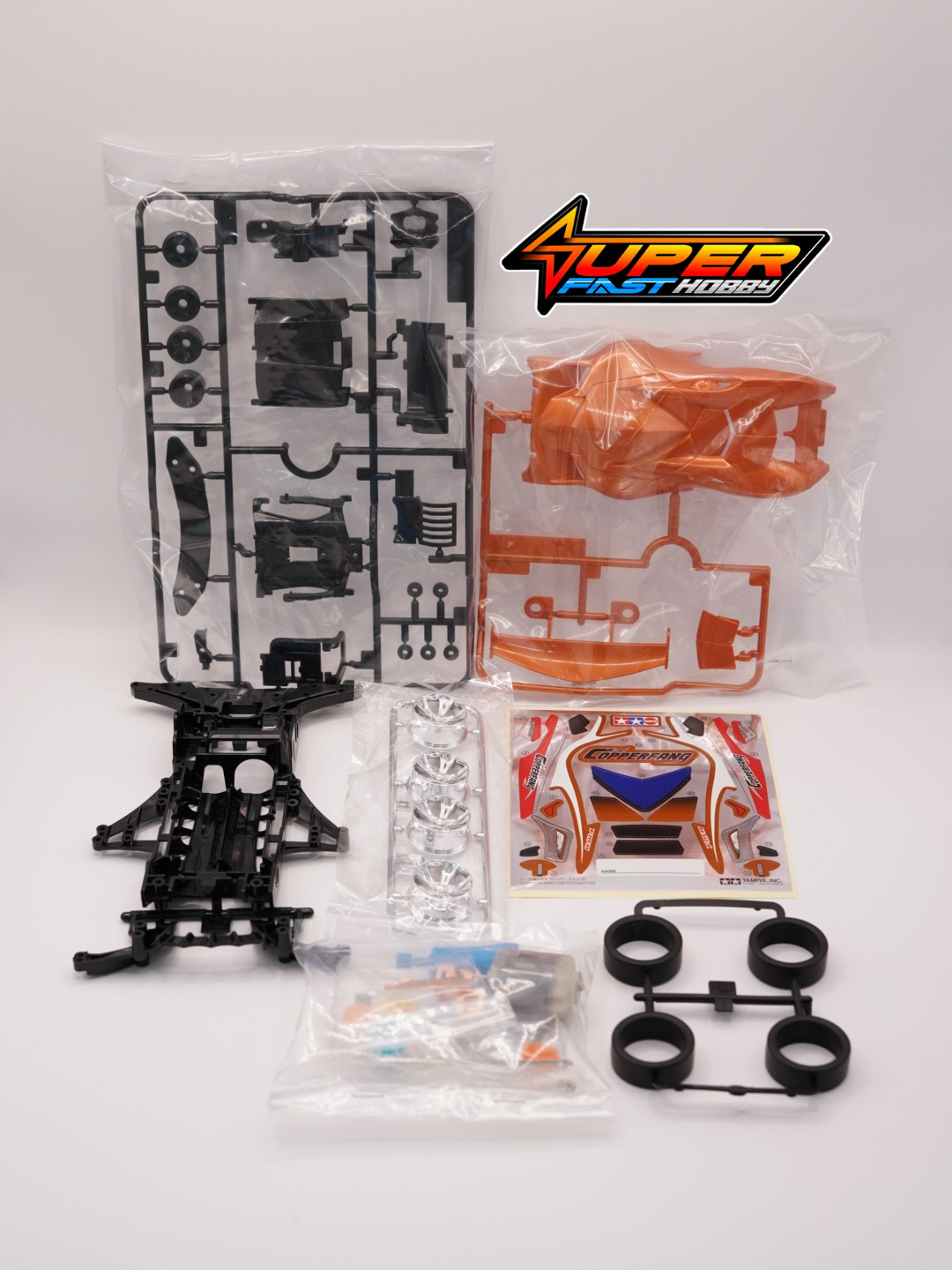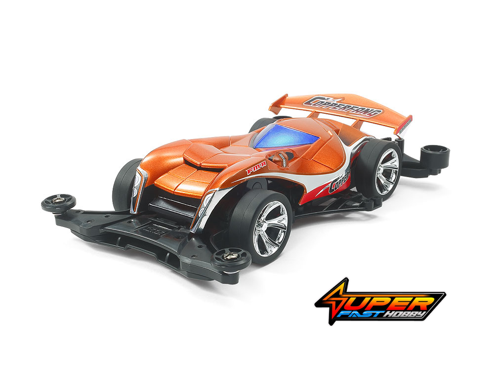 Bare your FangsThis assembly kit creates the Copperfang, a stylish Mini 4WD racer whose body won the MERIT AWARD in the 2018 Mini 4WD Design Contest held in Japan. Its memorable metallic orange color body features numerous design cues taken from the copperhead snake, and seems ready to strike with its fang-like front fenders. Stickers are included to depict details for the headlights and other body sections.