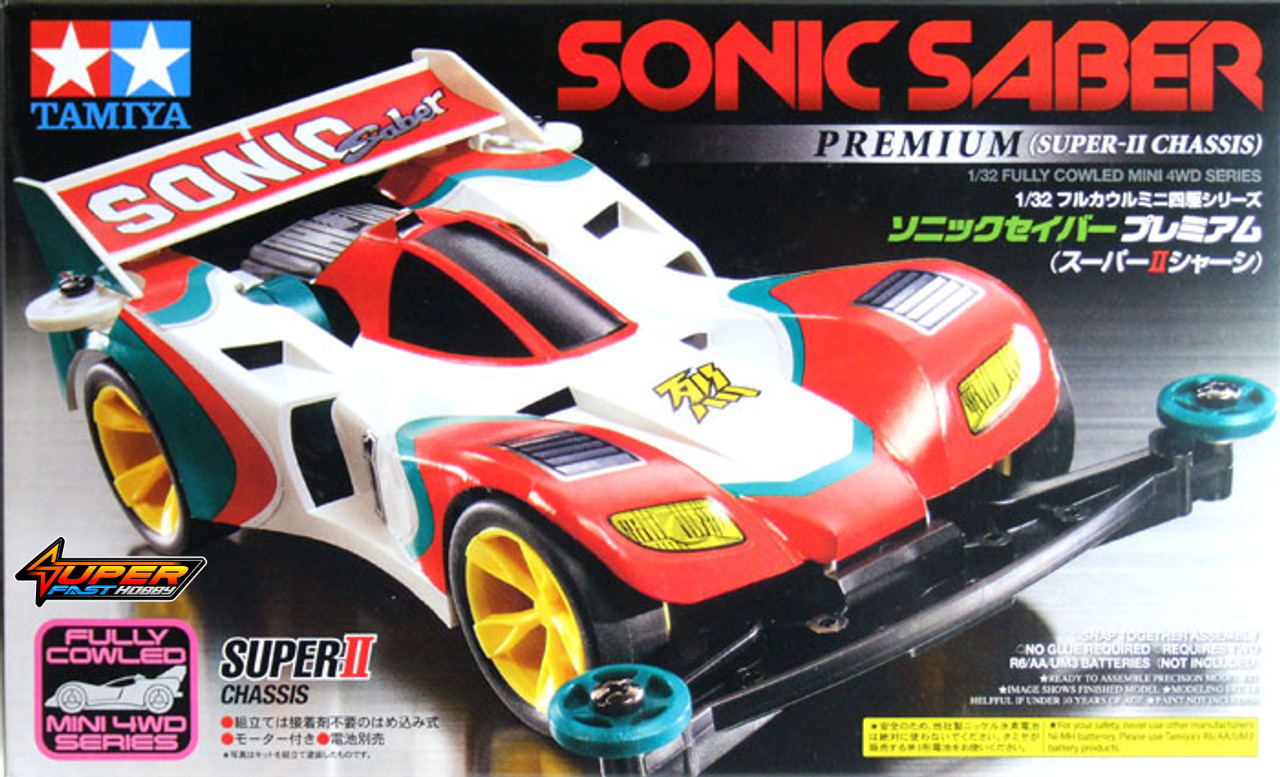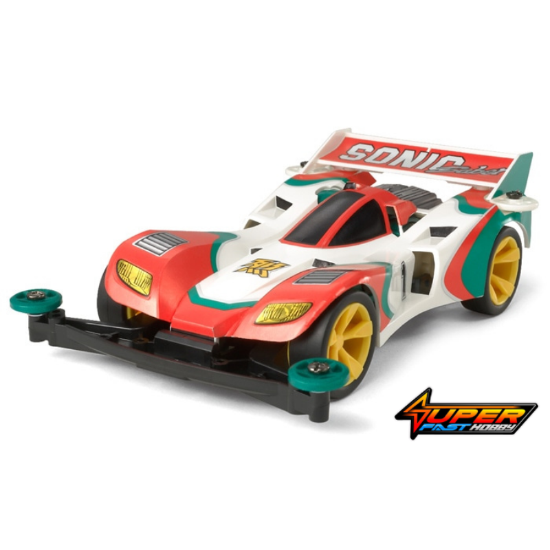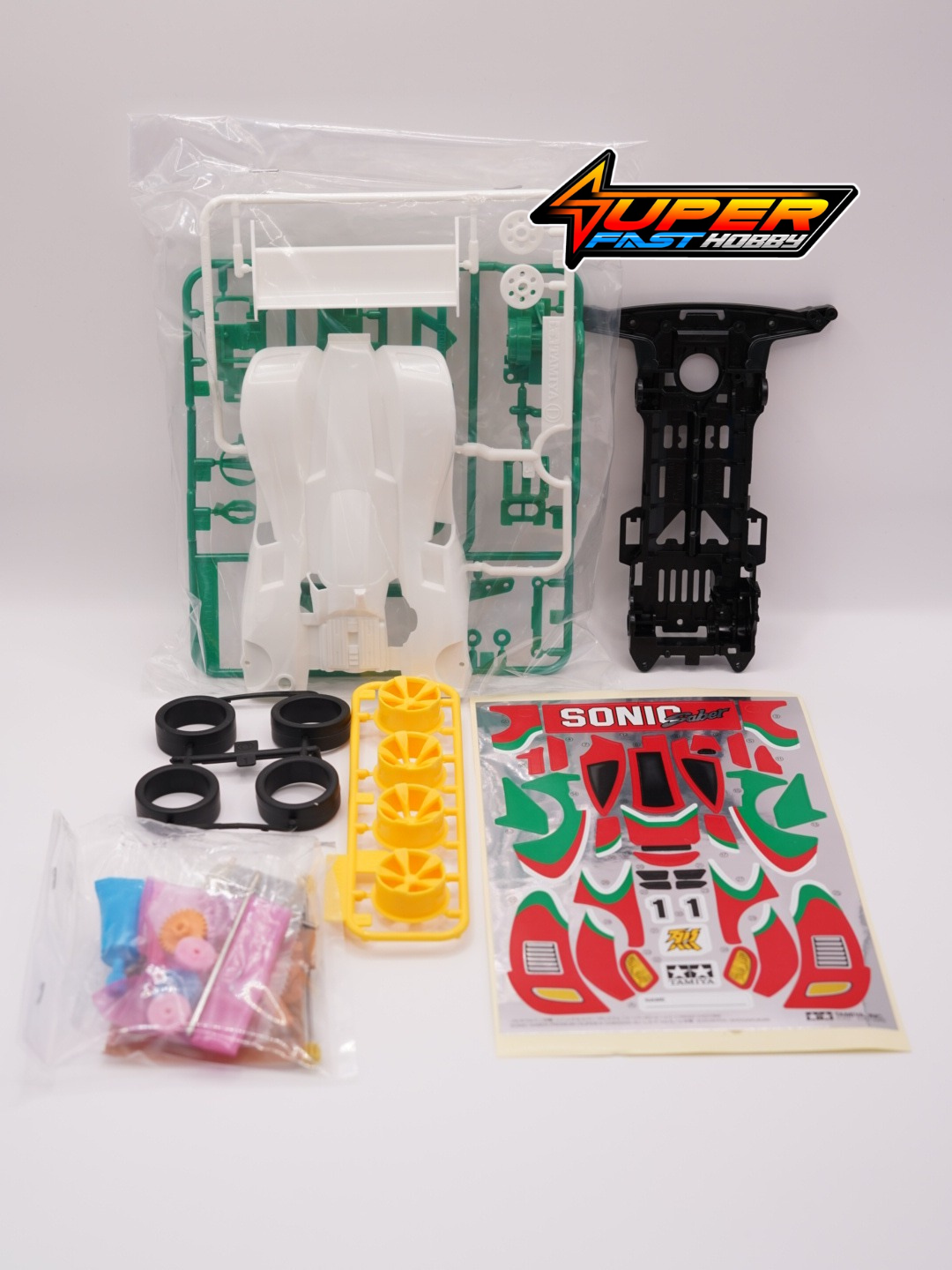 ★Retsu Seiba was the lead character of Japanese comic magazine “Bakuso Kyodai Let’s & Go” and his Sonic Saber now comes reproduced on the Super-II chassis. ★The chassis is made with black polycarbonate ABS resin. Battery holder and rear stay are made with metallic green ABS resin. ★Black low profile tires are mounted on yellow 5-spoke wheels. ★Newly designed metallic-like stickers included. ★Requires two R6/AA/UM3 batteries (sold separately).