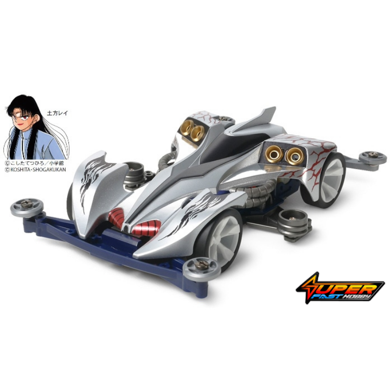 This is a premium version of the Ray Stinger, a machine which appeared in the Japanese cartoon “Let’s and Go!”as the car of one of the heroes’ rivals, Rei Hijikata. The body of the racer has a stylized front cowl dubbed the “stinger cowl”, plus other exciting features such as body side ducts and jet aero duct on the rear cowl. The silver scheme is accented perfectly by metallic stickers inspired by the design seen in the original cartoon.
