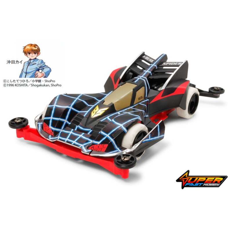 This is a premium Mini 4WD model assembly kit of the Beak Spider, which appeared in the Japanese cartoon “Let’s and Go!!” as the machine of the heroes’ rival, Kai Okita. The model is based upon the Super-II Chassis, and features the Beak-Spider’s trademark bulging front fenders and elongated front bumper, as well as the three-level wing. This instantly-recognizable style is perfectly suited to the black tones and cool markings created by metallic stickers.