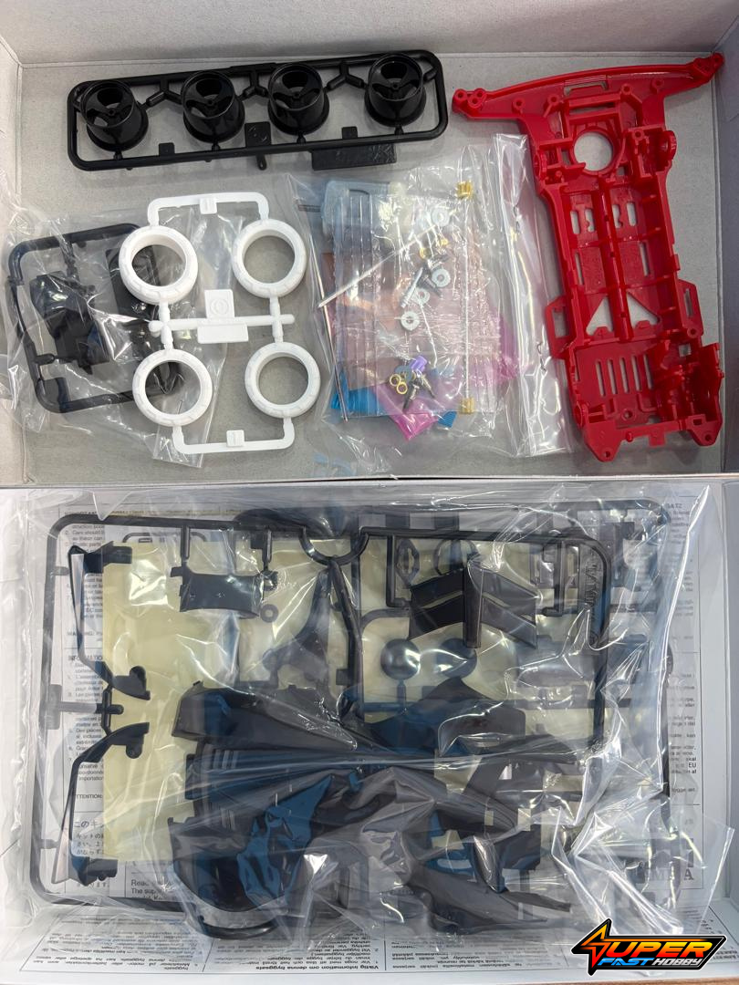 The Super-II chassis is molded in red ABS resin to contrast with the body color, and it offers increased toughness on an adaptable frame. Black is used as the color for A parts including the battery holder and gearbox cover. Bumpers and rear stay feature multiple attachment points to allow a wide range of settings. Three-spoke black wheels are mounted with 24mm-diameter tires, while a motor and super-speed 3.5:1 gears are included.