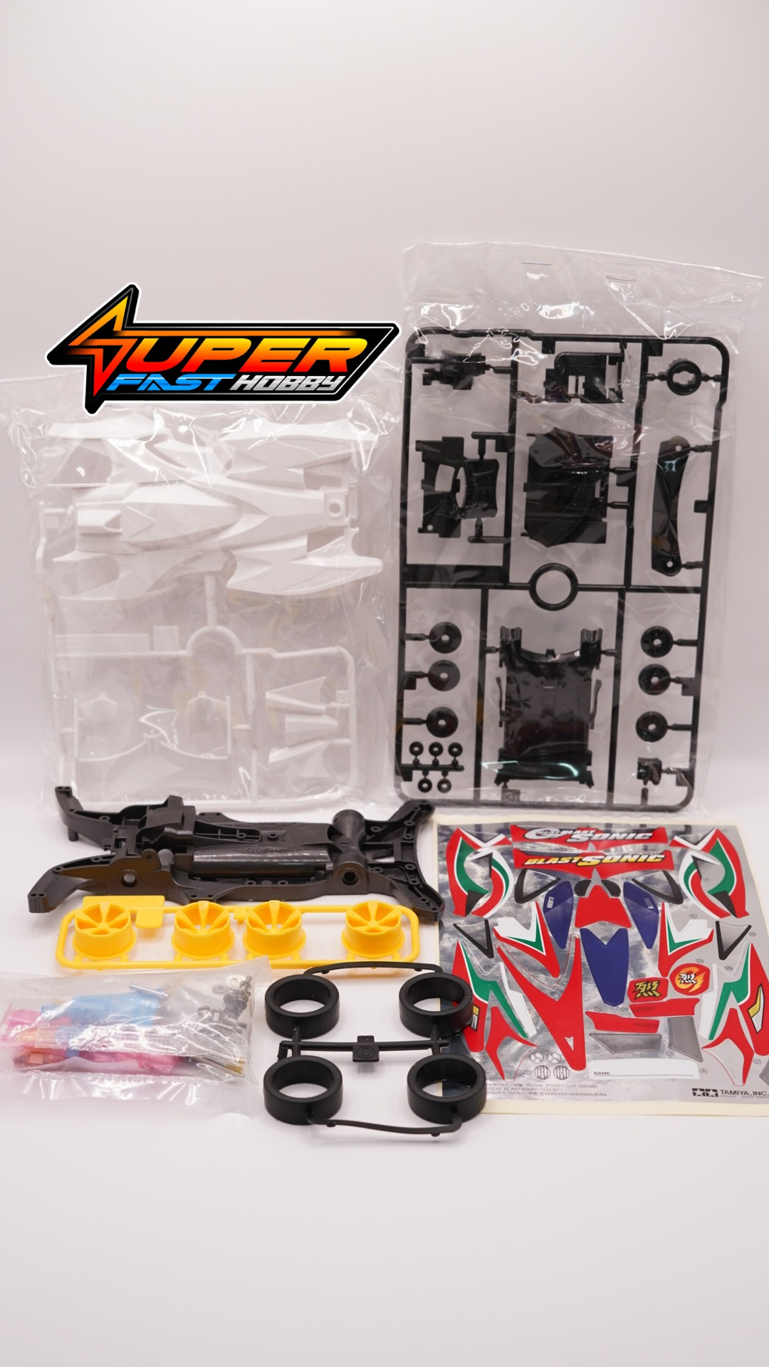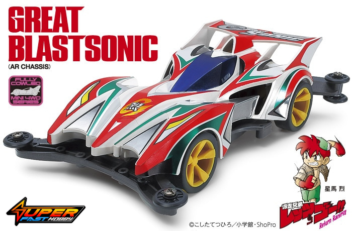This plastic Mini 4WD model assembly kit creates the Great BlastSonic, the machine driven by hero Retsu Seiba in the popular Mini 4WD comic series “Let’s & Go!! Return Racers!!” The series of Sonic models has a proud history, and this exciting model continues the traditional marking and body styles, with a sharp modern twist! What’s more, by simply modifying the nose and rear wing parts with a modeling knife, Mini 4WD fans have the choice of two different yet equally fascinating body styles!
