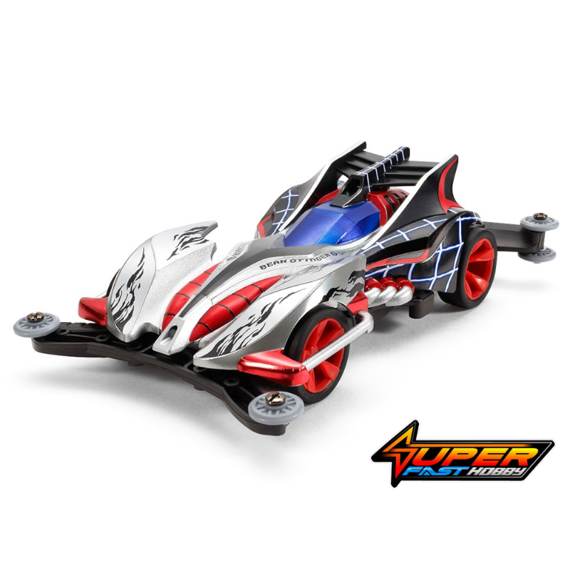 This plastic Mini 4WD model assembly kit creates the Beak Stinger G car which appears as the hero’s rival machine in the popular Japanese comic “Let’s & Go!! Return Racers!!” It is a fascinating fusion of inspiration from three classic 1990s Mini 4WD racers – the Brocken Gigant, Ray Stinger and Beak Spider. A silver ABS resin body comes with metallic stickers for decoration.