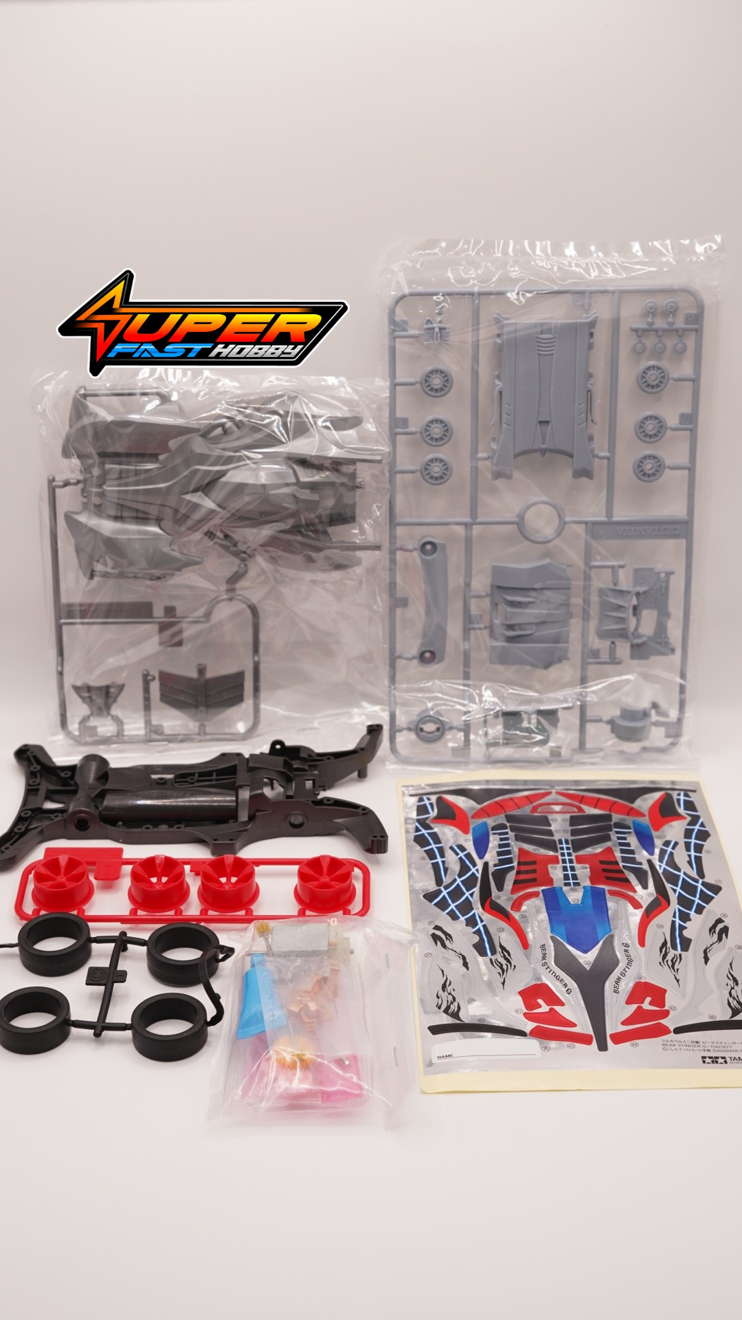 The AR chassis is designed to offer its driver durability, customizability and ease of maintenance, all of which are vital ingredients for a successful Mini 4WD racer. Its aerodynamic form smoothly allows air to pass through the chassis interior as the machine runs, performing the vital function of cooling the batteries and motor and extending their effectiveness. The underpanel and diffuser can be removed from the model without taking off the body, while a low-friction rear skid bar is fitted to slash time loss experienced on tricky slope sections, and keep the racer on the track where it belongs. Features red 5-spoke wheels, black low-profile tires and a 3.5:1 gear ratio.