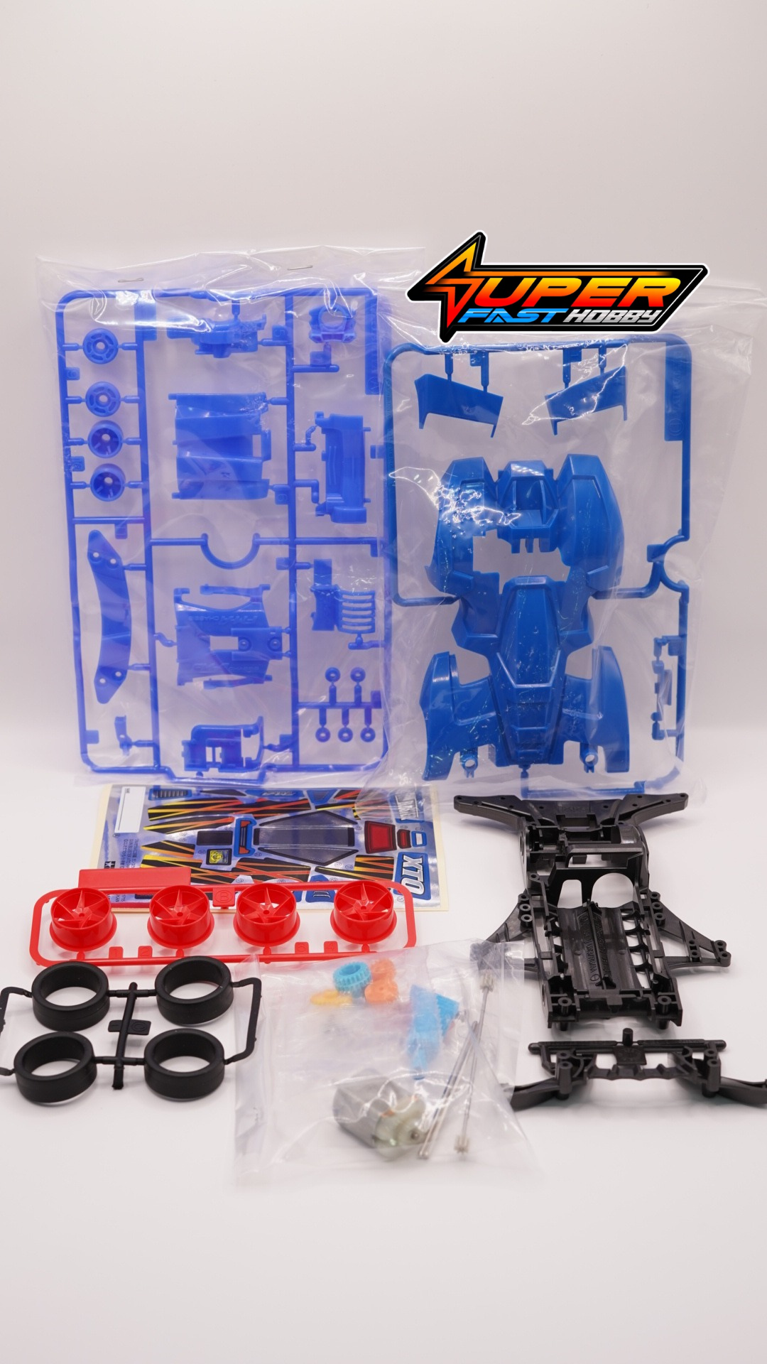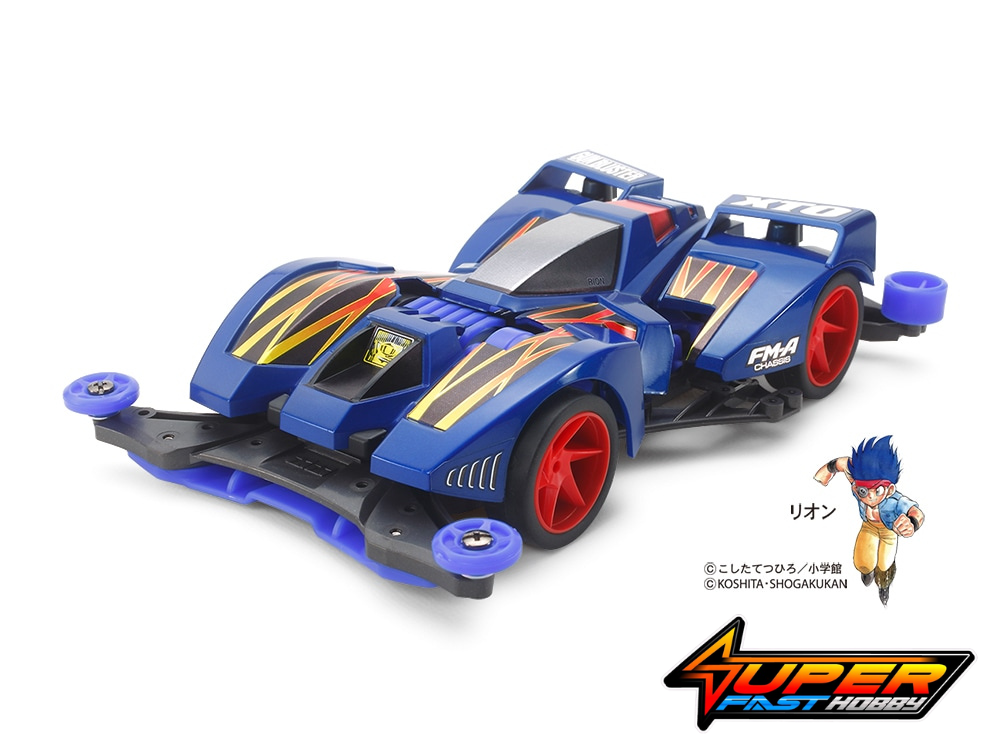 This Mini 4WD assembly kit creates a premium version of the Gun Bluster XTO, a car which featured in the 1997 Mini 4WD movie “Let’s & Go!! WGP: Mini 4WD Dai Tsuiseki!” It sports a muscular body design with angular cowl and cockpit sections and a distinctive split rear wing. Dedicated stickers are included to decorate the blue color ABS resin body, and feature smart yellow and red designs.