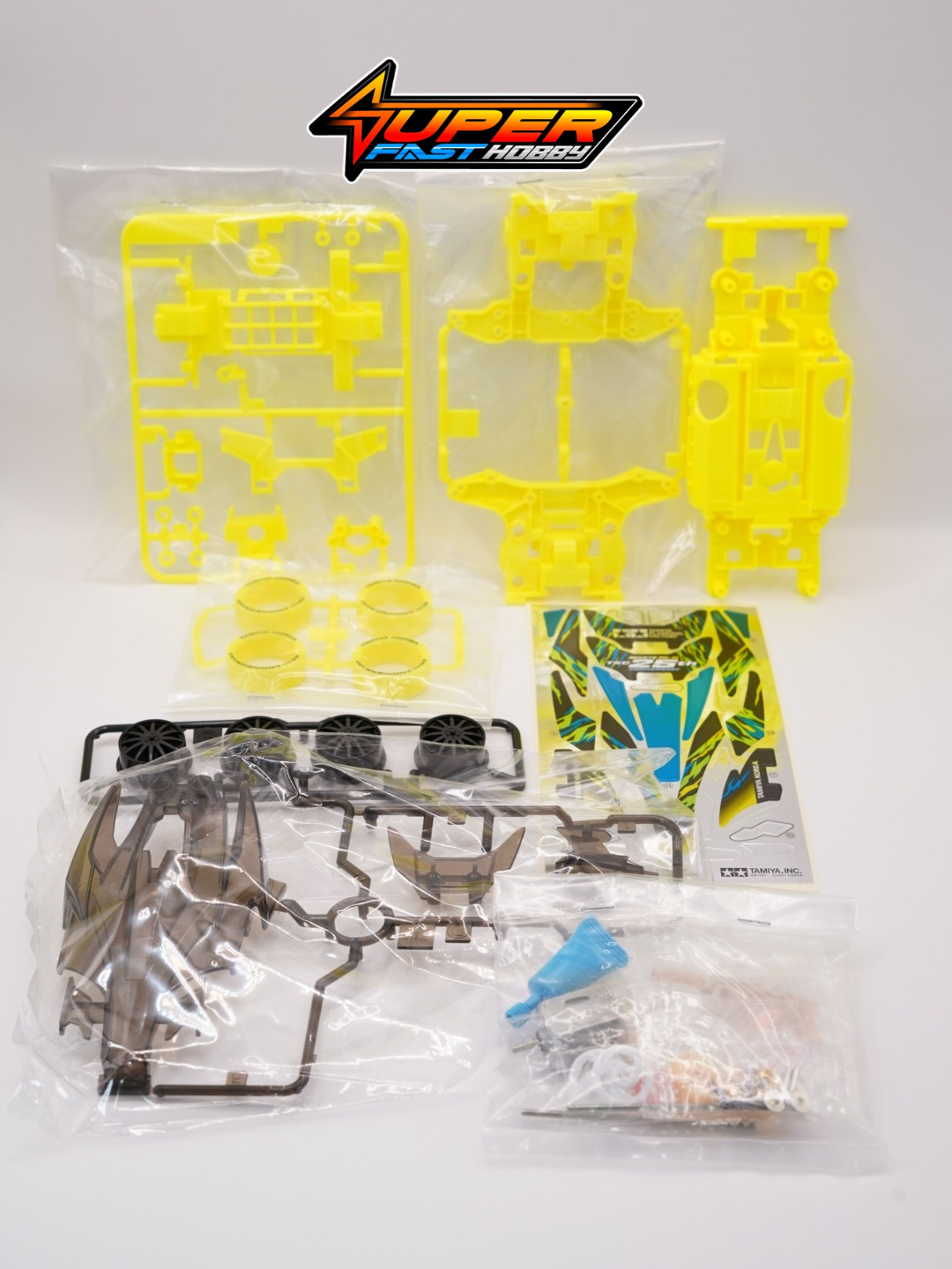 Chassis: The kit uses the MS Chassis, which is molded in a fluorescent yellow ABS resin. The chassis is a three-piece unit that can be assembled without glue.