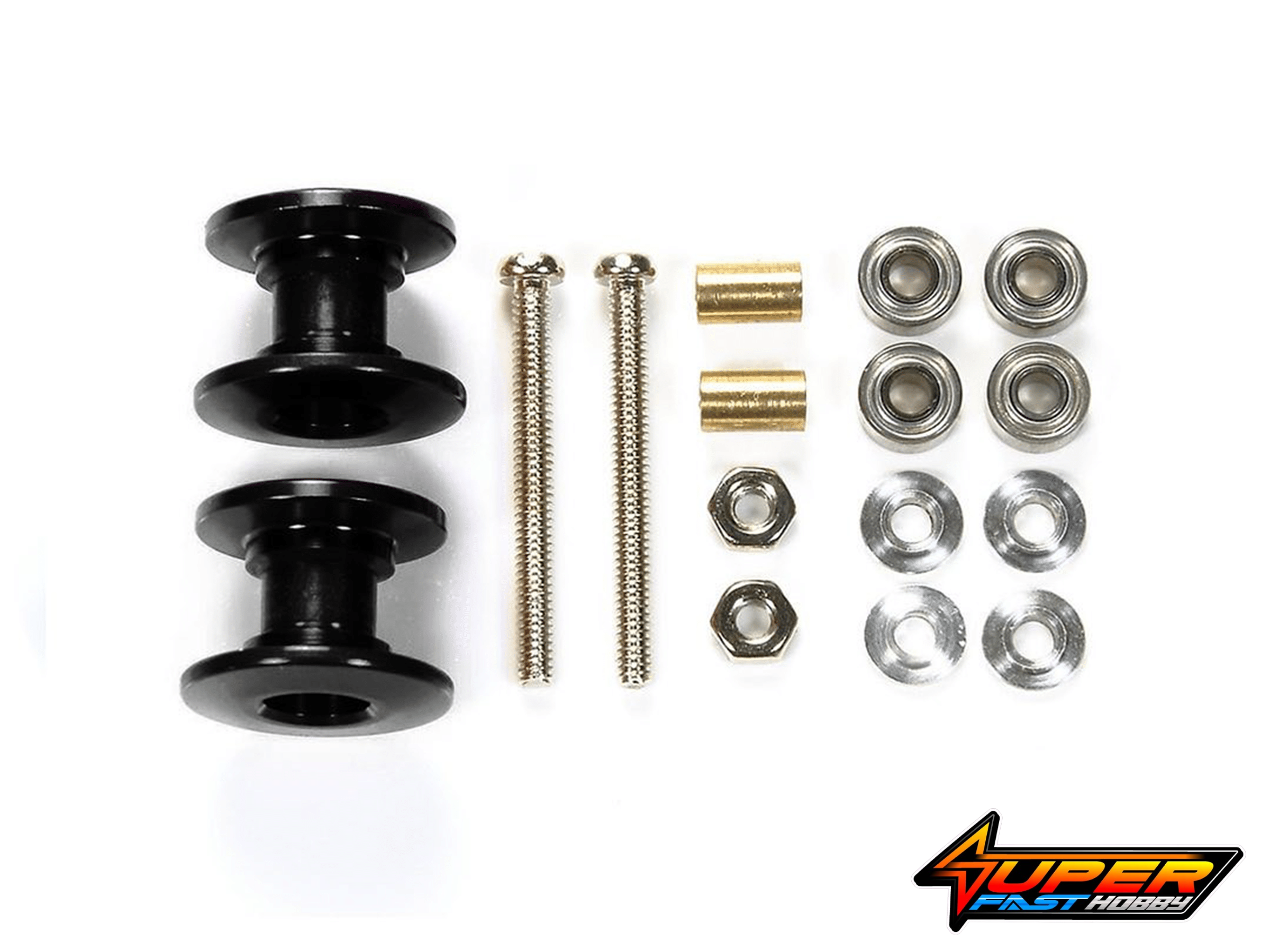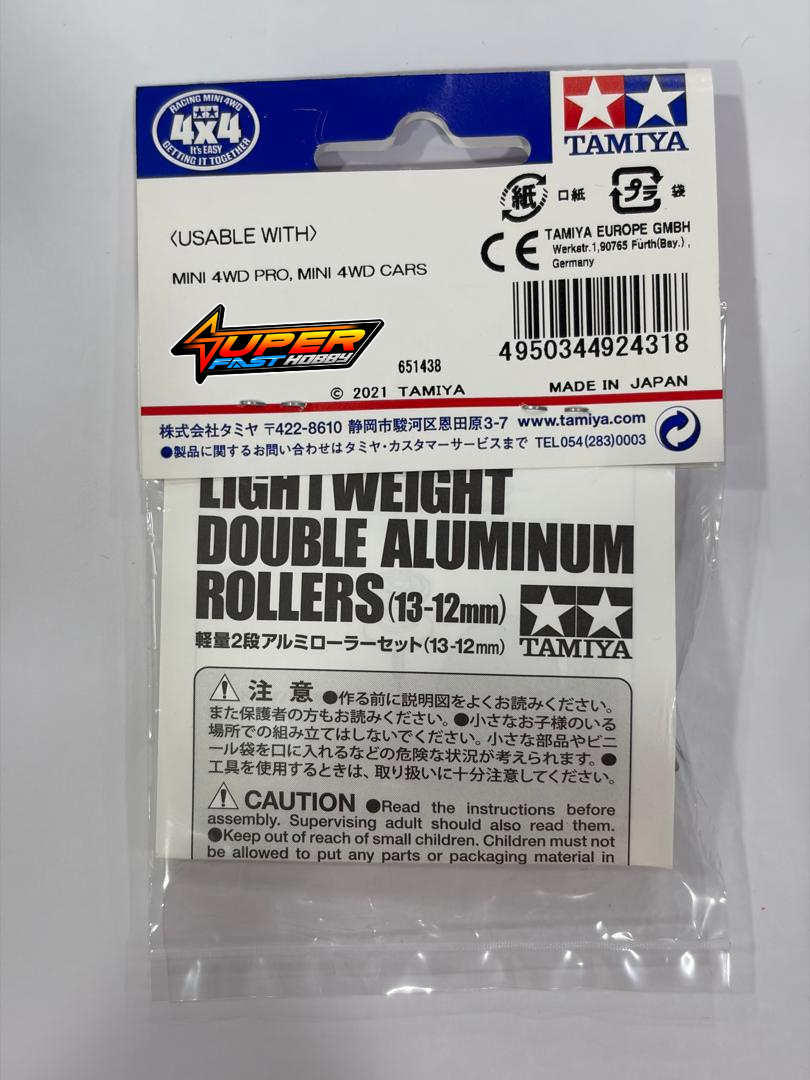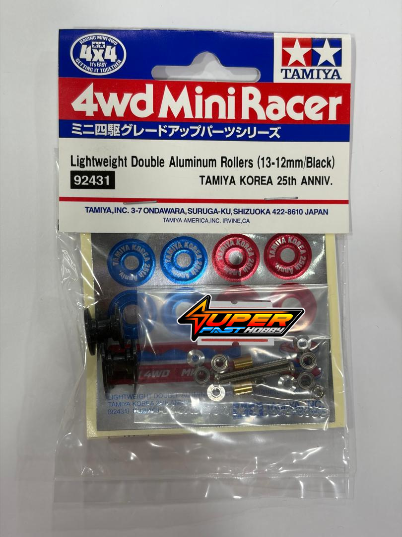The Tamiya 92431 is a limited edition Mini 4WD Lightweight Double Aluminum Rollers (13-12mm, Black), released to commemorate the 25th Anniversary of Tamiya Korea. These rollers are designed to improve the performance and stability of Tamiya Mini 4WD and Mini 4WD PRO cars.