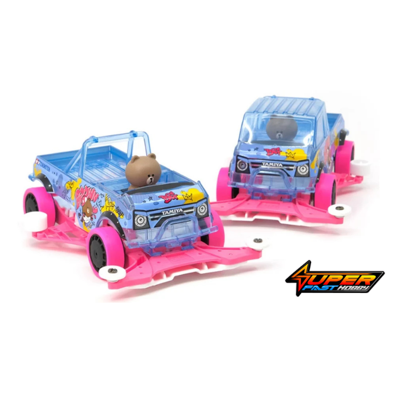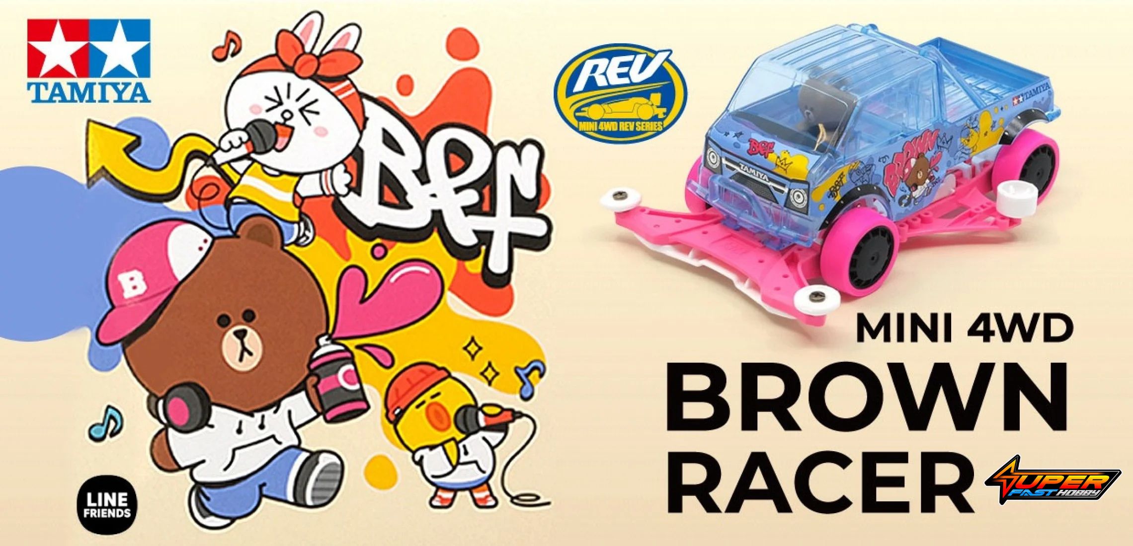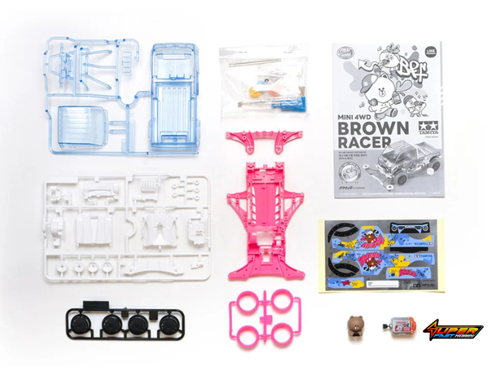 The Tamiya 92443 is a 1/32 Mini 4WD Brown Racer (FM-A Chassis), a special edition model created in collaboration with the LINE FRIENDS franchise. This kit features the popular character Brown from the LINE messenger app as the driver. It was originally an exclusive release for the South Korean market in September 2023.
