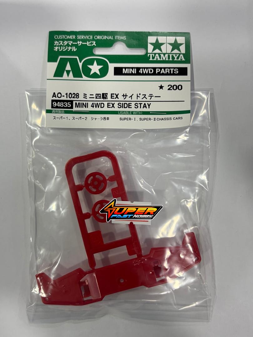 The Tamiya 94835 AO-1028 Mini 4WD EX Side Stay is a spare or replacement part for Mini 4WD car chassis. It is a plastic accessory designed to strengthen the car’s chassis and improve stability and durability during high-speed racing.