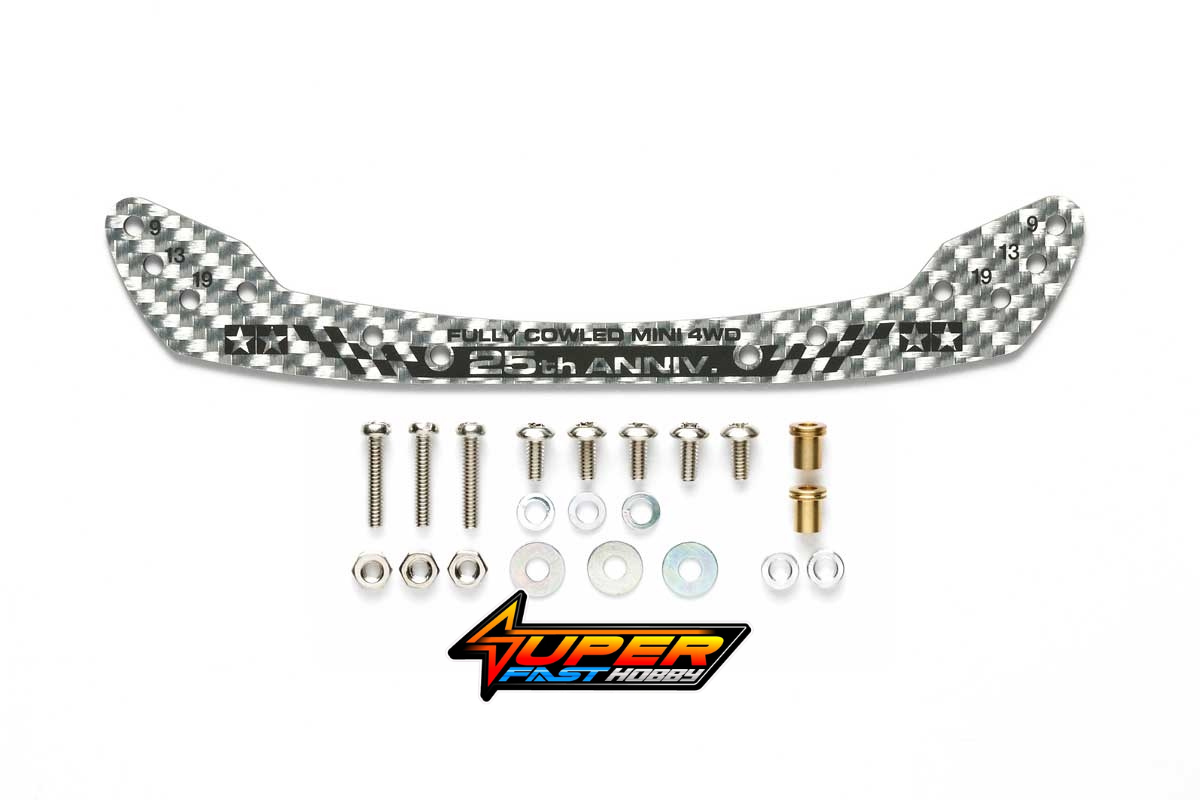 Design: It features a unique silver carbon pattern with special black printed wording commemorating the 25th anniversary of the Fully Cowled Mini 4WD series. The design has smooth curves that match the body lines of the series.