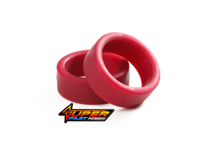 Low-friction tires offer a great opportunity to change your car’s setup on a Mini 4WD race track because they ensure that the car “bounces” less after jump landings. This particular set comes in maroon color.