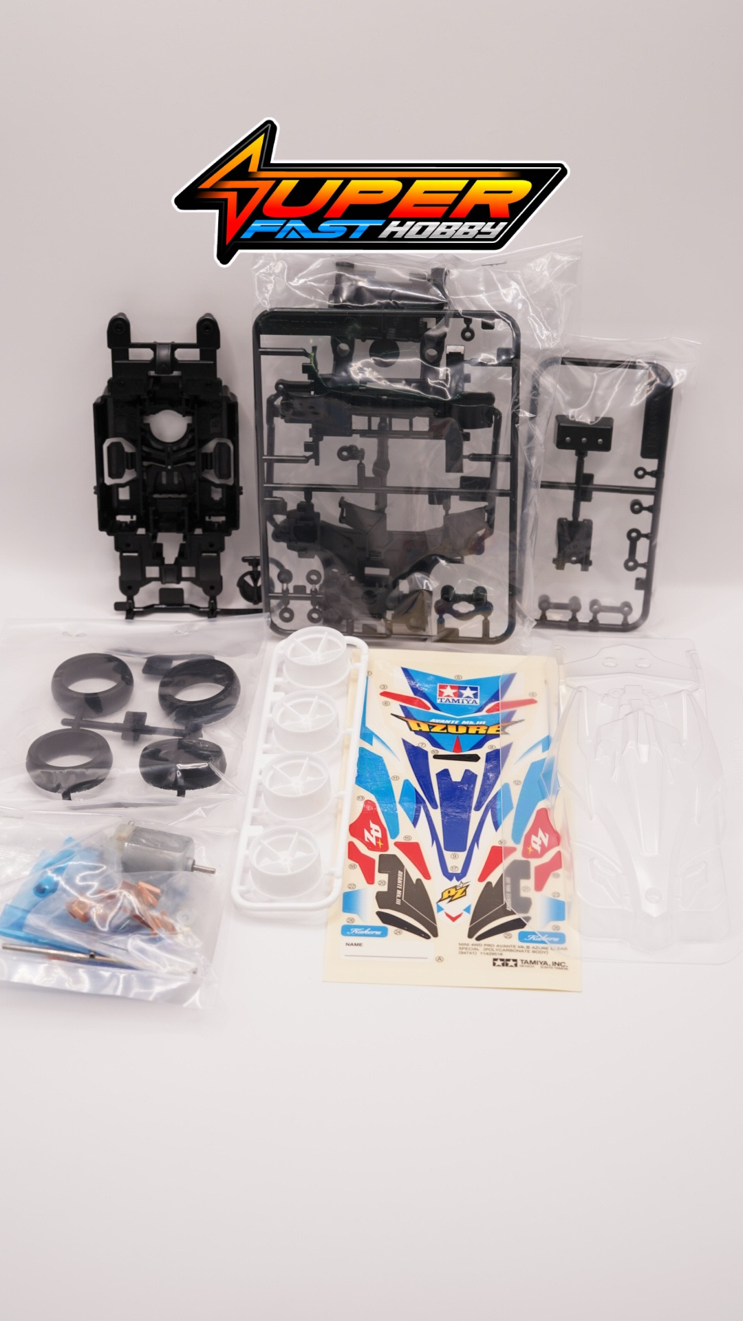 This assembly kit creates the Avante Mk.III Azure Clear Special, a special model with lightweight clear polycarbonate body – being light, the body also makes for a lower center of gravity. Clear stickers are included to decorate the model. The 3-piece MS Chassis is molded in black, and consists of N-02 and T-01 units, plus a lightweight Center unit. White large-diameter narrow lightweight wheels are paired with black barrel tires featuring pad printed white sidewall lettering. This race spec model also includes hollow shafts.