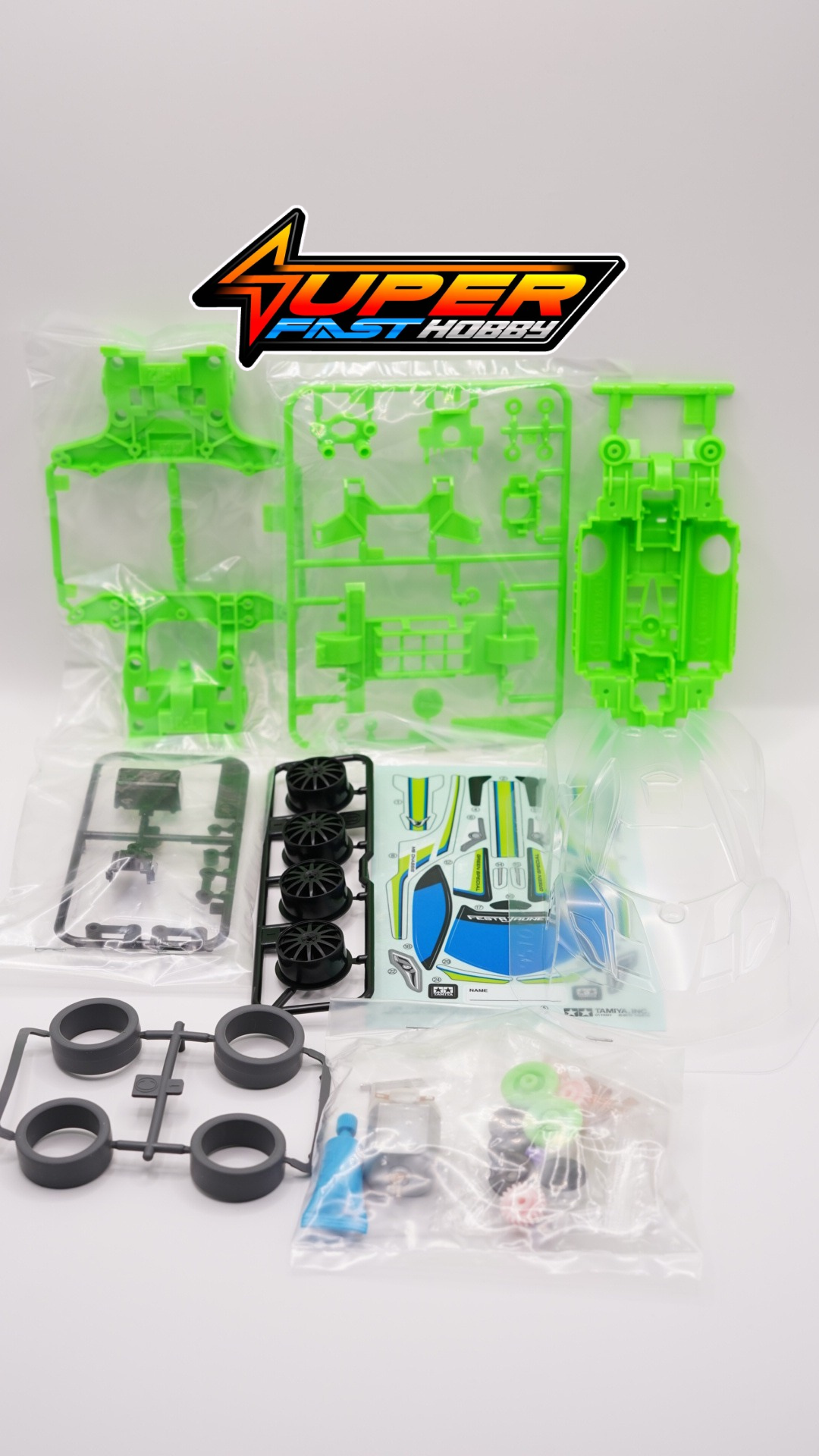 MS Chassis: The kit uses the modular, three-piece MS chassis (N-02 nose, T-01 tail, and center unit), which is molded in a fluorescent green ABS resin. This direct-drive, double-shaft motor system is known for its stability and cornering ability thanks to its 80mm wheelbase.