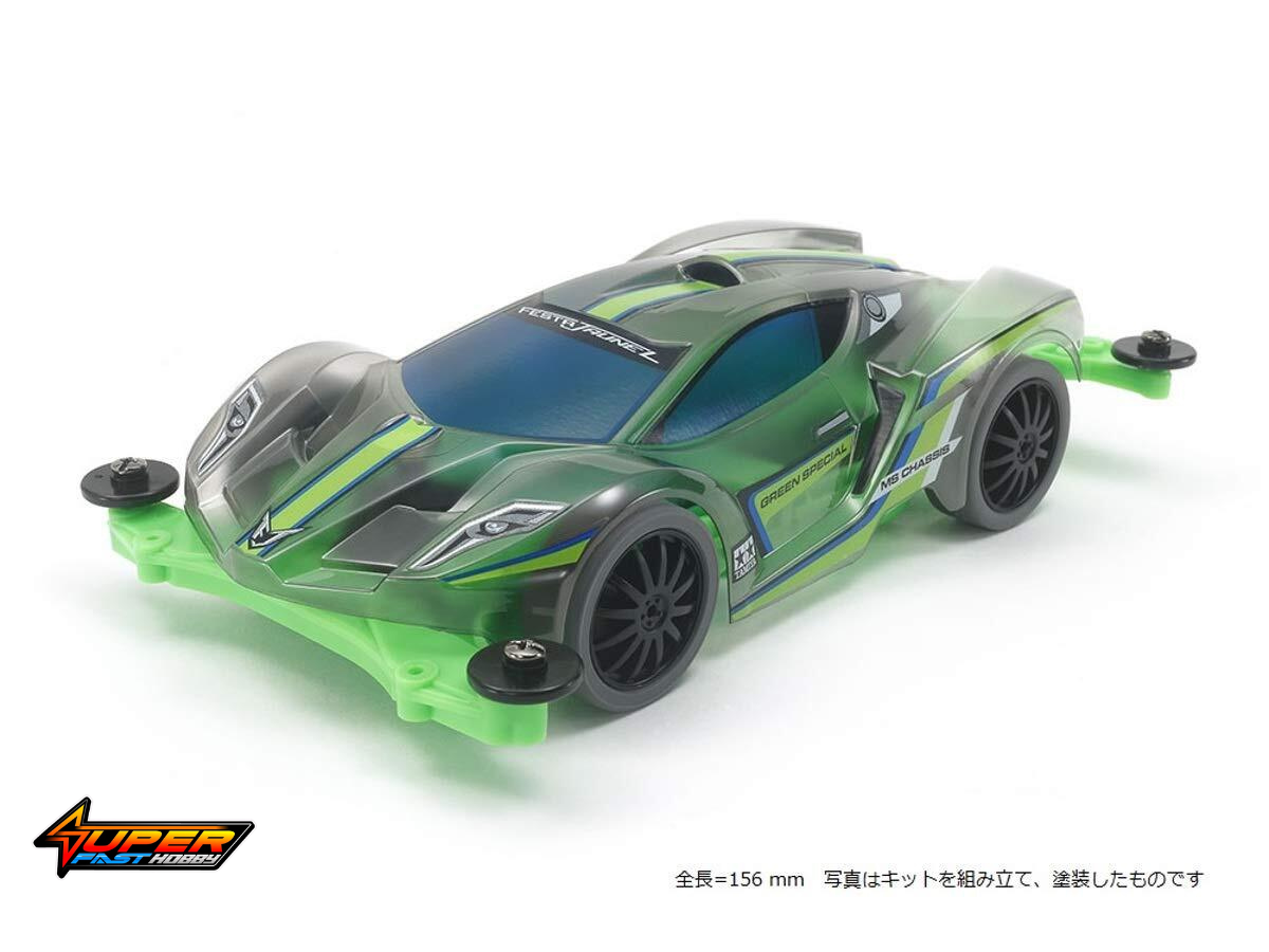 The Tamiya 95485 is an assembly kit for the Festa Jaune L Green Special Mini 4WD racer. It is a special edition of the popular Festa Jaune model, featuring a lighter body and a fluorescent green MS chassis.