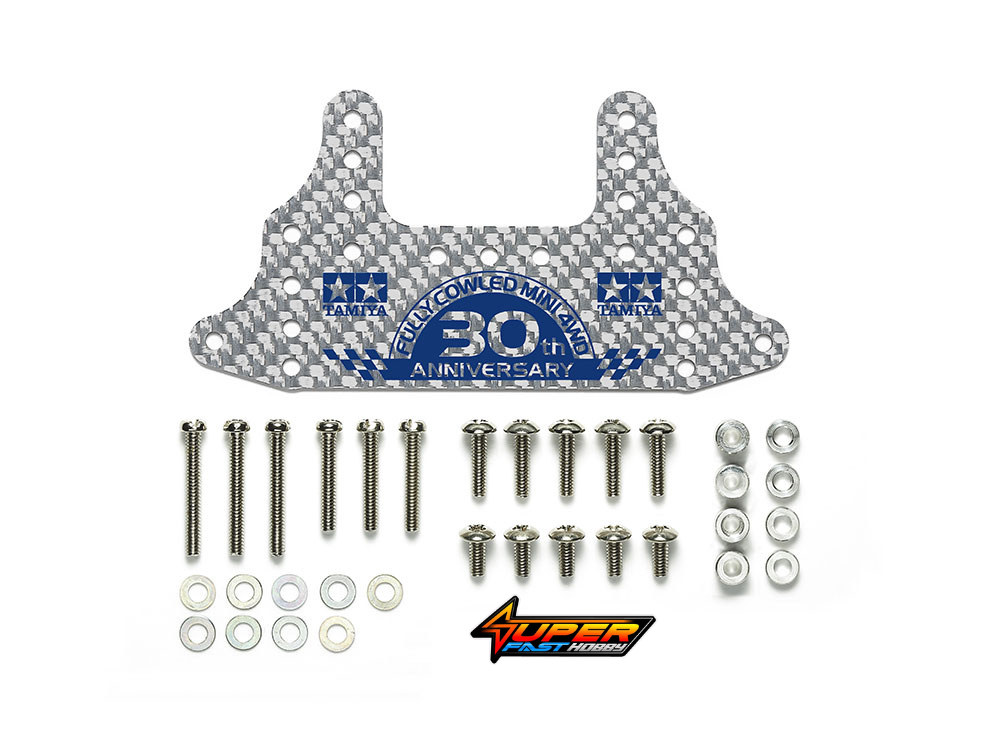 ★This lightweight and rigid 1.5mm thickness stay has a big surface area for maximum versatility in placement of your brake sponge. ★It commemorates thirty years of the Series, and features a rather special silver color carbon fiber pattern plus wording printed in blue. ★Holes can be used to attach mass dampers and other accessories. ★Comes with a range of screws, aluminum collars and other parts for attachment. ★Use with separately sold brake sponge products.