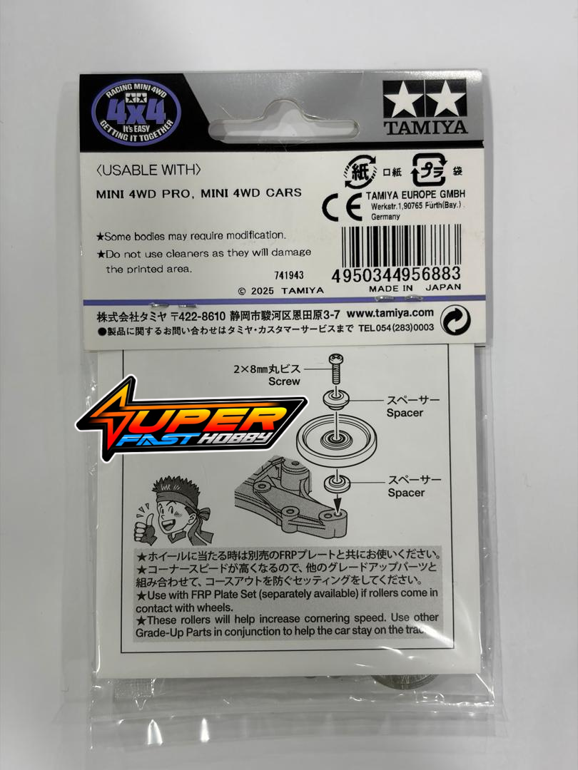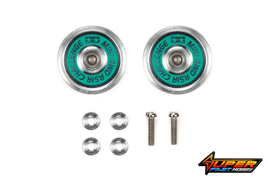 • These aluminum rollers have “MINI 4WD ASIA CHALLENGE” lettering and Tamiya logo print on a green background. (Do not use cleaners as they will damage the printed area.)