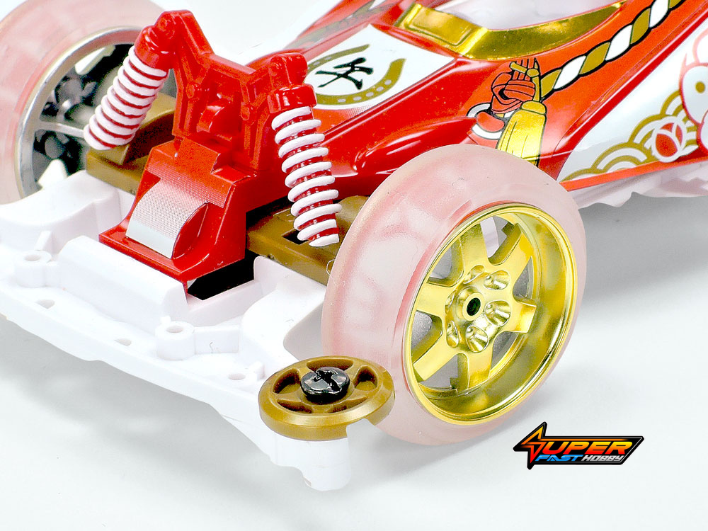 The Super-II chassis offers impressive toughness on an adaptable frame. Here, it appears in white ABS plastic and is matched with gold color battery holder, rear stay and roller parts. The model also features turn switches and double attachment points for the rear stay. Multiple bumper and rear stay attachment holes allow a range of set-up options. Matte gold plated 6-spoke wheels have stickers with HAPPY NEW YEAR and YEAR OF THE HORSE 2026 messages that are visible through the clear large-diameter tires, and the model comes with 5:1 gears and a motor.