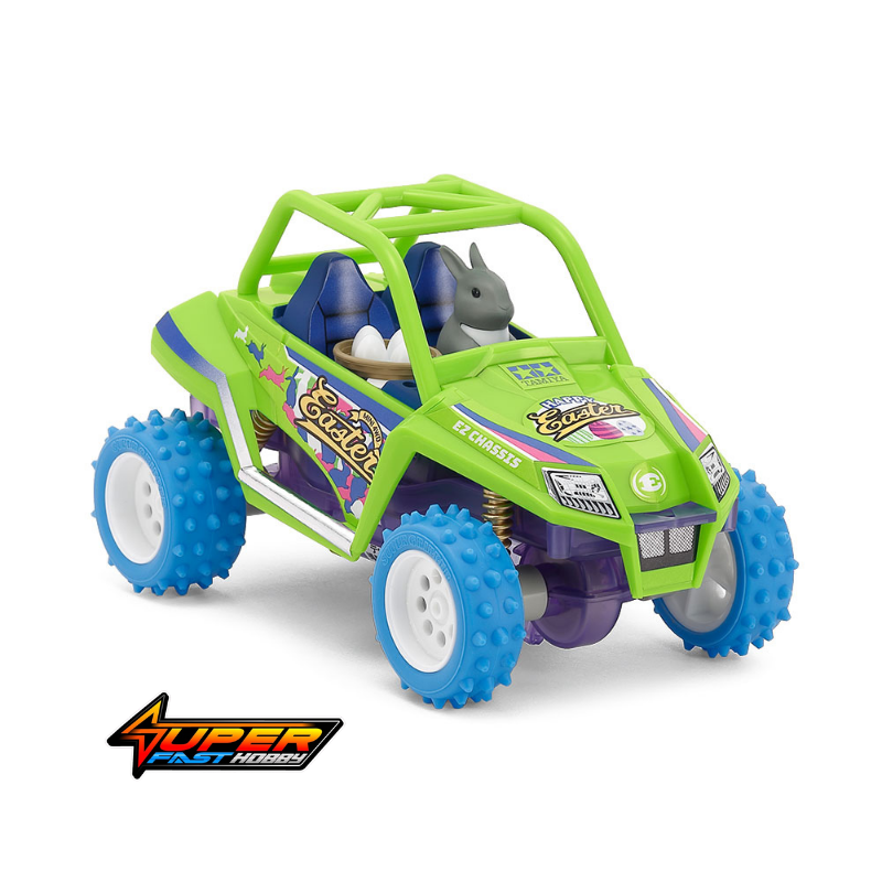 Easter eggs and the Easter Bunny are closely associated with the annual Christian festival of Easter, and they are the stars of this special Easter-themed Mini 4WD car assembly kit. The model uses a UTV-style body molded in light green plastic, and features the pre-assembled and painted bunny inside the roll caged cockpit with a basket of eggs. The 4-wheel drive EZ chassis has a central double-shaft motor and requires no cement or screws. Dish design wheels are paired with spike tires for great performance on slopes.