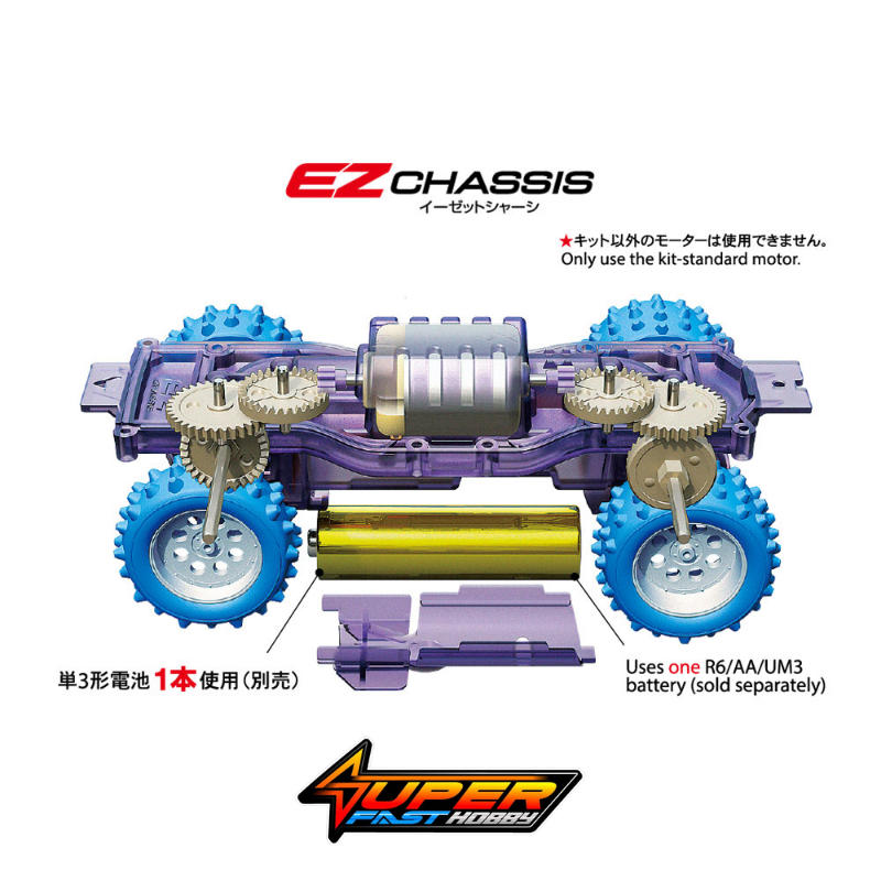 EZ ChassisThe EZ chassis is assembled simply by snapping and fitting parts together, and runs on one R6/AA/UM3 battery. Gears are placed into the chassis frame with a motor on top, and then the cover is snapped into place; chassis parts are violet tinted plastic to let you see what is happening inside. White wheels are paired with grippy spiked tires and the model’s 50:1 gear ratio ensures that it runs at a manageable speed and has great torque for a powerful drive.