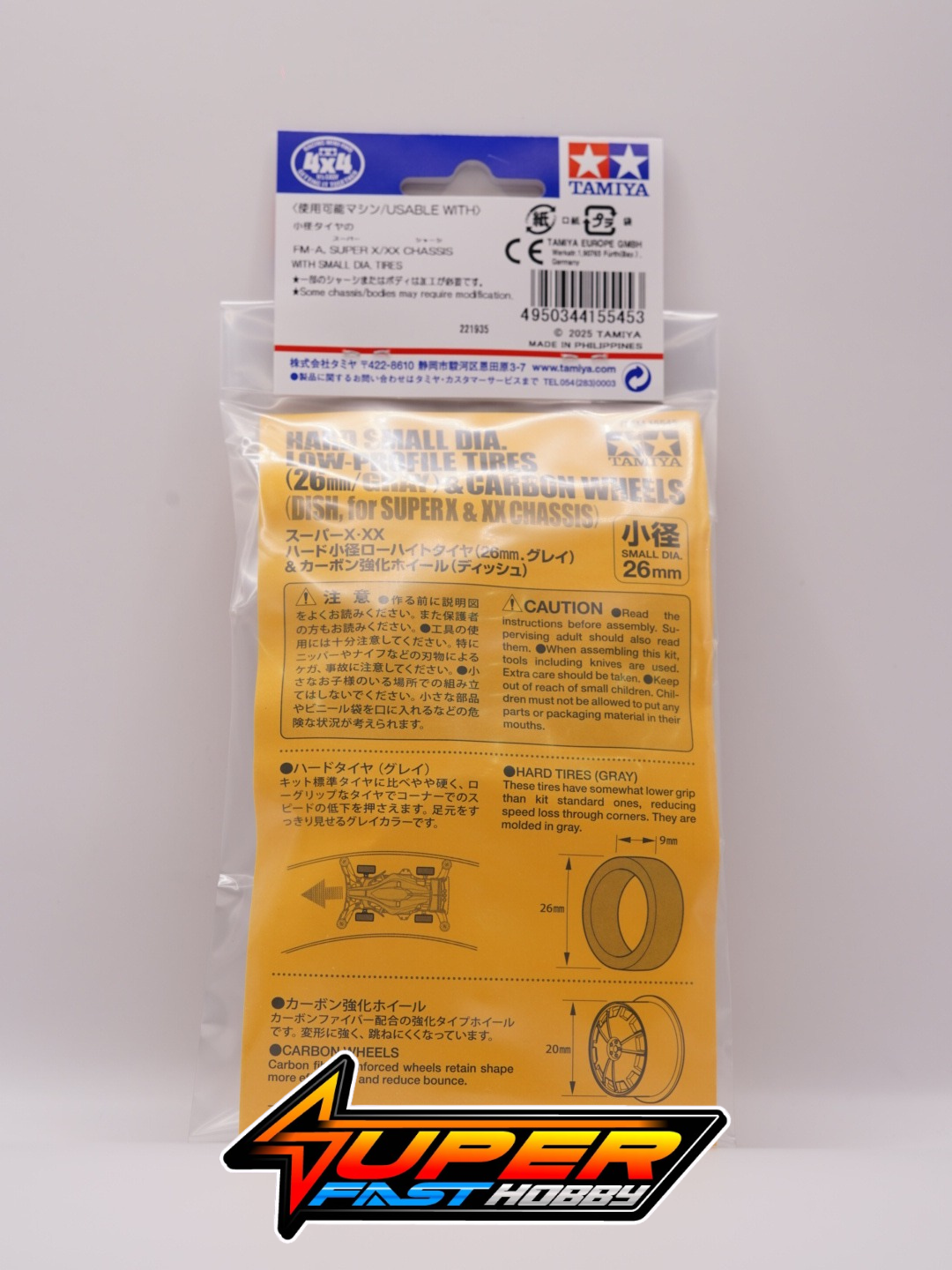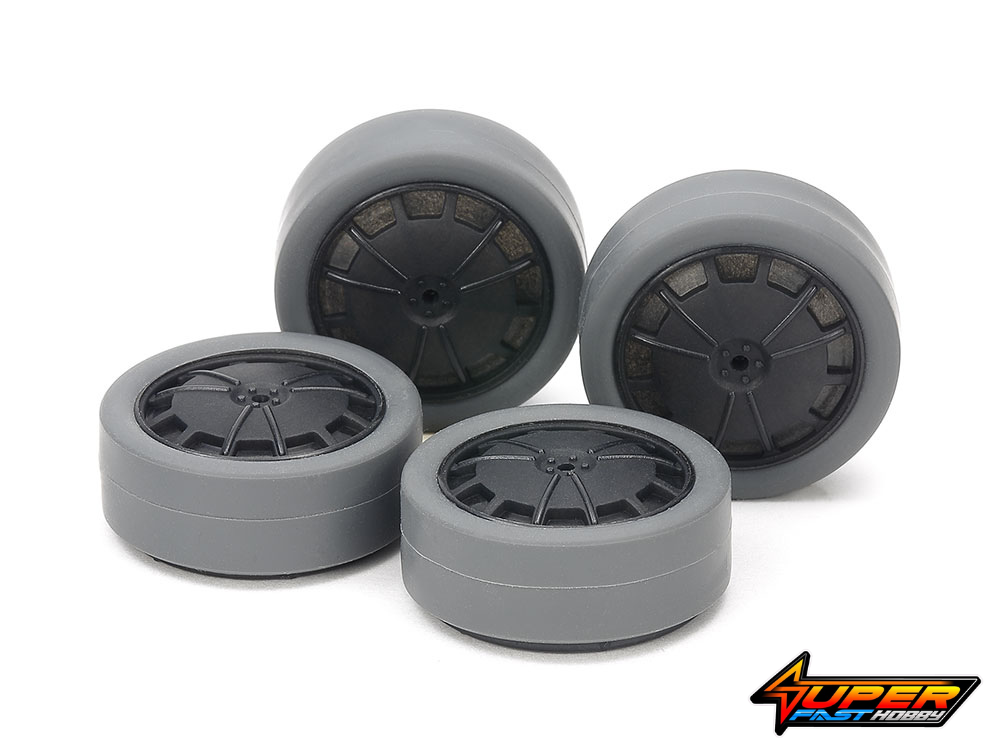 This handy set includes four each of dish design carbon fiber reinforced wheels and hard small diameter low-profile tires. Carbon fiber wheels are highly durable and reduce bounce, while the tires are harder than standard ones, lowering their grip and helping your car maintain corner speed. Black wheels and gray tires make for a realistic look. ★Hard tire compound – push firmly to attach to wheel.